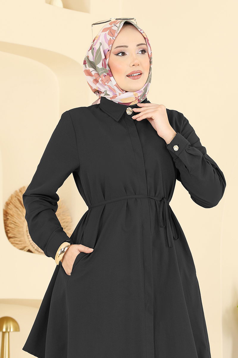 Featuring stylish and functional design, the Belted Terylene Shirt TUNIC can be comfortably used in all seasons. This hijab shirt, which can be washed at 30 degrees on a delicate cycle, is made of terylene fabric and features a shirt collar design. The unlined product is displayed on a size 38 model. It offers convenience with hidden pocket detail, both front buttons and hidden buttons. The ties are optionally detachable, and the cufflinks are actively usable. Ideal for daily use as well as special occasions, this shirt offers both comfort and elegance.