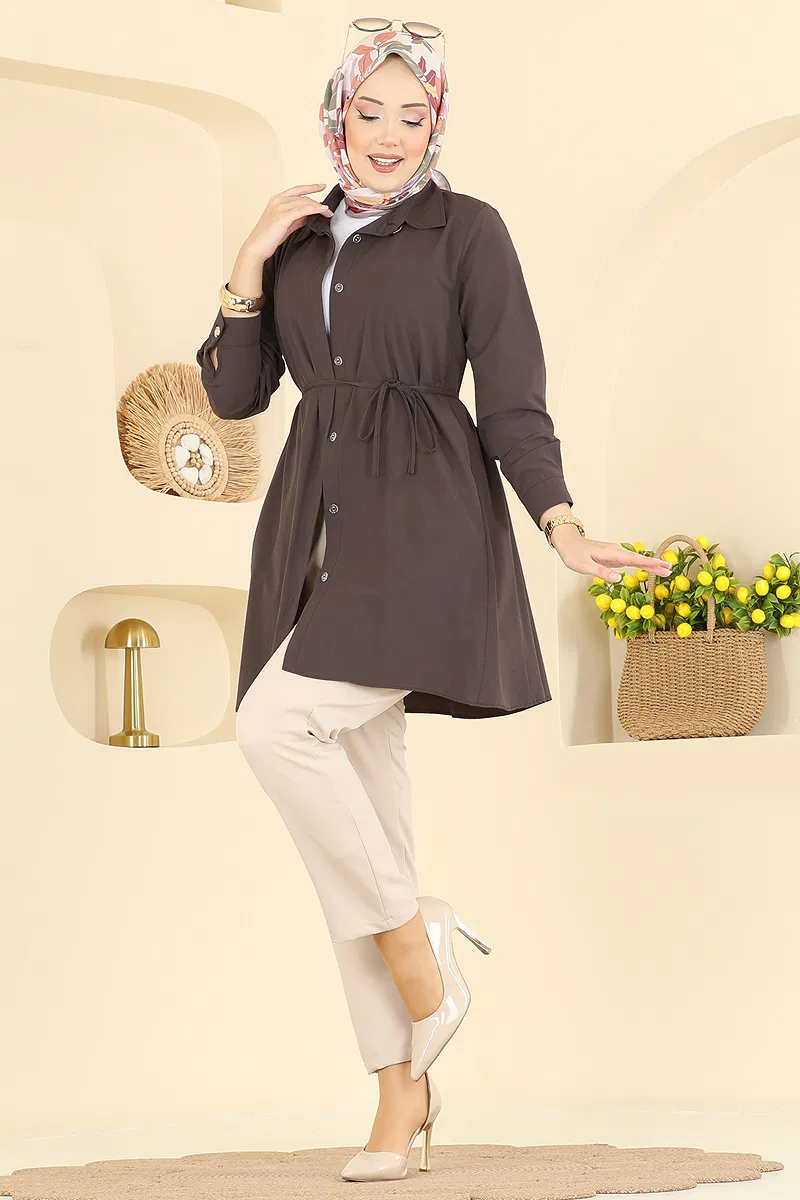 Featuring stylish and functional design, the Belted Terylene Shirt TUNIC can be comfortably used in all seasons. This hijab shirt, which can be washed at 30 degrees on a delicate cycle, is made of terylene fabric and features a shirt collar design. The unlined product is displayed on a size 38 model. It offers convenience with hidden pocket detail, both front buttons and hidden buttons. The ties are optionally detachable, and the cufflinks are actively usable. Ideal for daily use as well as special occasions, this shirt offers both comfort and elegance.