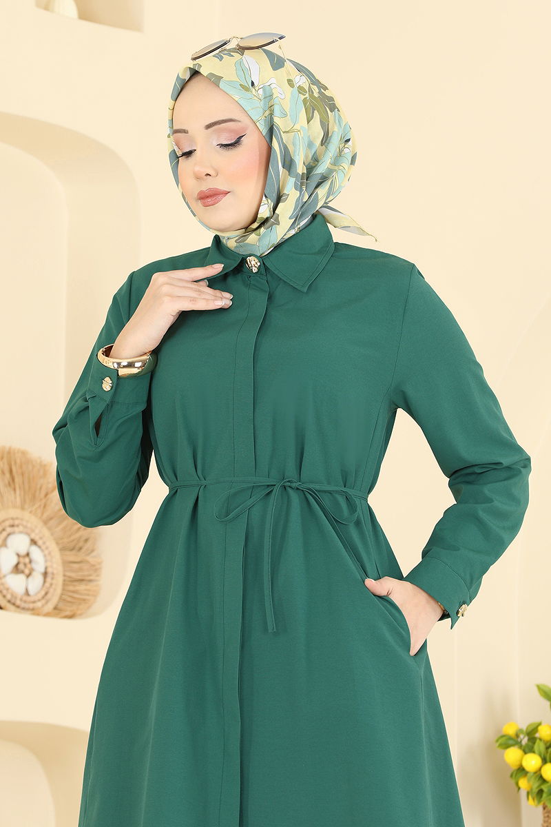 Featuring stylish and functional design, the Belted Terylene Shirt TUNIC can be comfortably used in all seasons. This hijab shirt, which can be washed at 30 degrees on a delicate cycle, is made of terylene fabric and features a shirt collar design. The unlined product is displayed on a size 38 model. It offers convenience with hidden pocket detail, both front buttons and hidden buttons. The ties are optionally detachable, and the cufflinks are actively usable. Ideal for daily use as well as special occasions, this shirt offers both comfort and elegance.