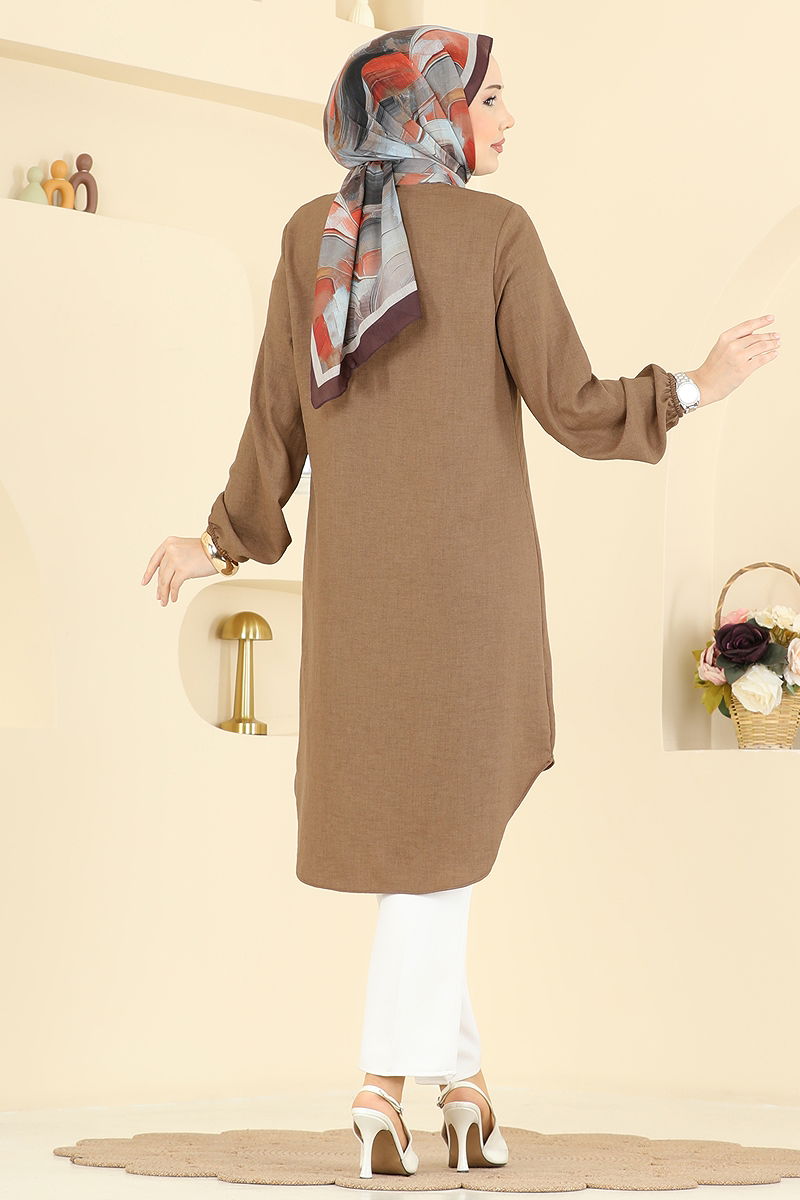 The Half-Buttoned Front Tunic is a modest wear item that can be comfortably worn across all seasons. Washable at 30 degrees without spinning, this product is suitable for delicate wash. Made of Sofia linen fabric, the tunic features a bike neck and front usable buttons. It also has elasticated cuffs, and the product displayed is size 40.