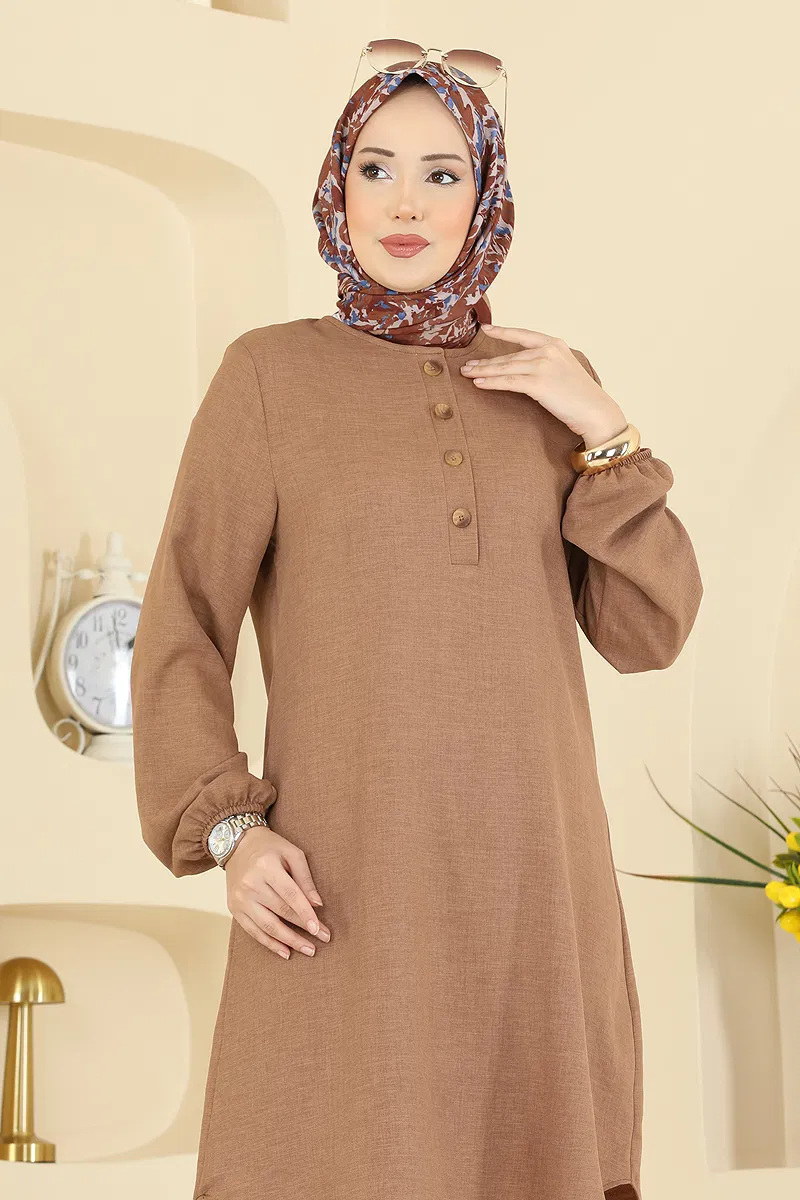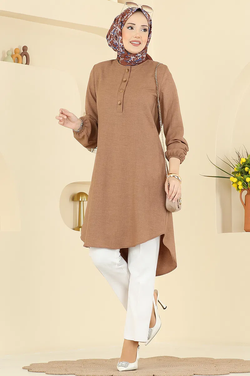 The Half-Buttoned Front Tunic is a modest wear item that can be comfortably worn across all seasons. Washable at 30 degrees without spinning, this product is suitable for delicate wash. Made of Sofia linen fabric, the tunic features a bike neck and front usable buttons. It also has elasticated cuffs, and the product displayed is size 40.