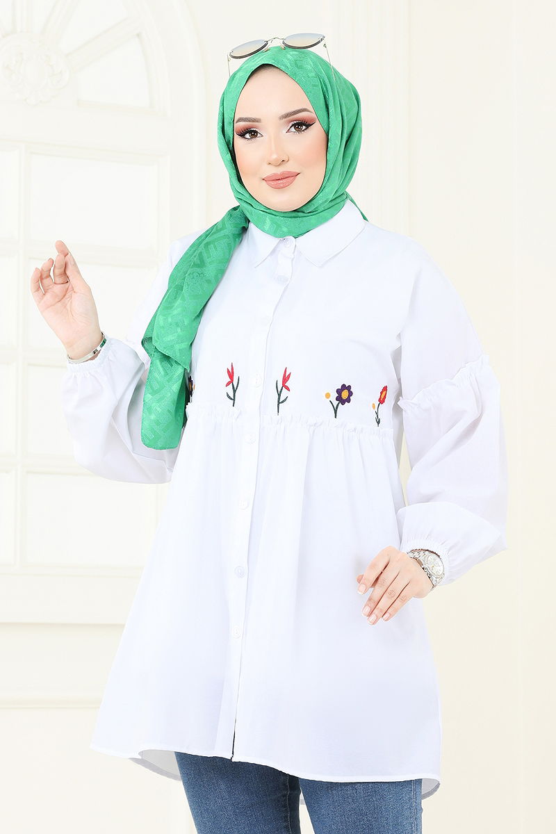 Embroidered Tunic is a stylish modest wear product that can be comfortably used in all seasons. Made from poplin fabric, this tunic offers practical wear with its shirt collar design and button-down front. It can be washed at 30 degrees with delicate care. Its unlined structure and elasticized cuffs enhance comfort. Embellished with embroidery details, this tunic helps you achieve a sophisticated look. (Model wears size 38; Height: 165 cm, Chest: 88 cm, Waist: 68 cm, Hip: 99 cm, Weight: 56 kg.)