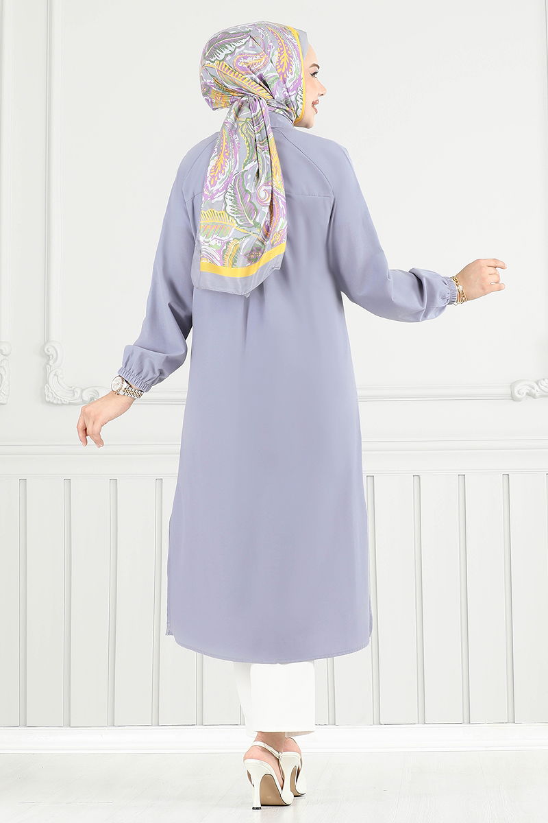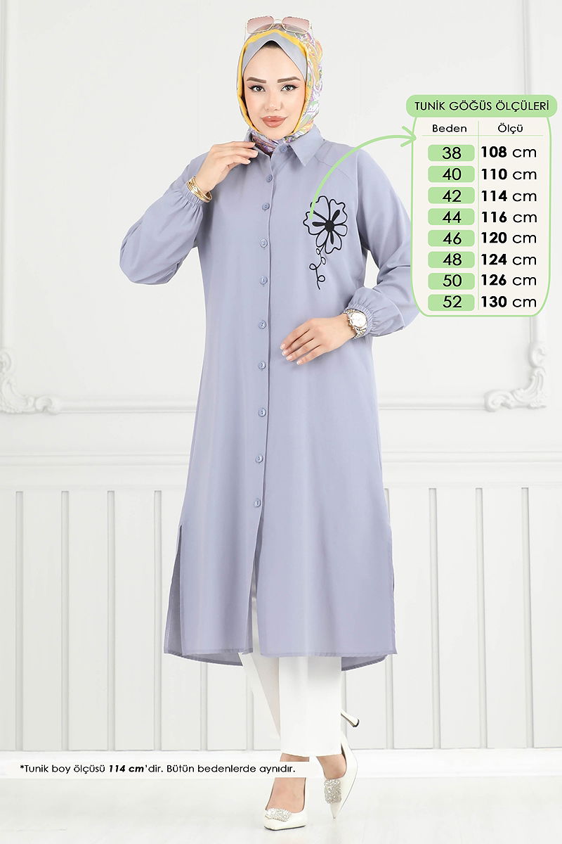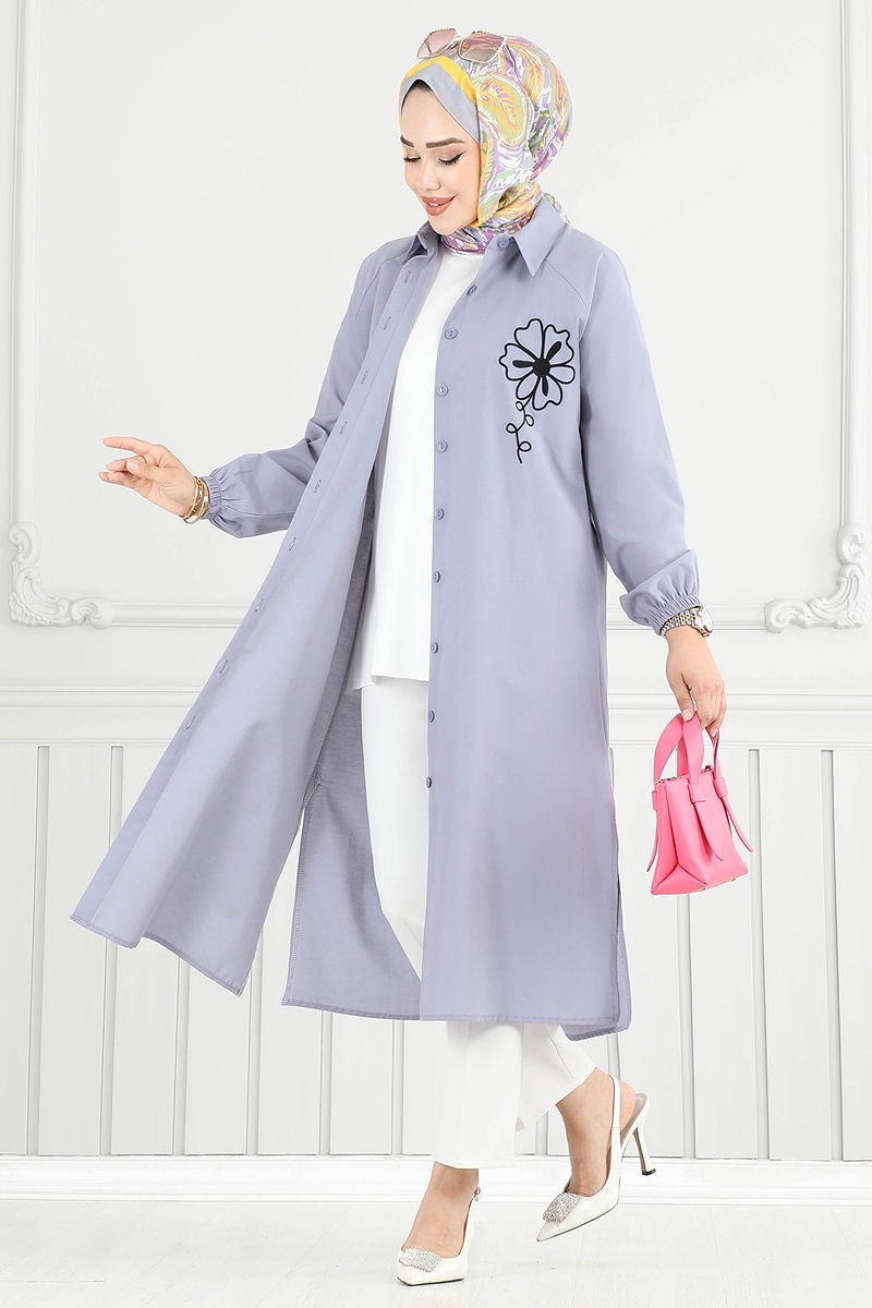 Product Feature : It is a new season hijab fashion product. The product has a Shirt collar. The product has From the front buttons. The tunic has a side slash.. Unlined. Embroidery details are sewn. The cuff is rubberized. There may be a tonal difference in the product due to concept photo shoots.