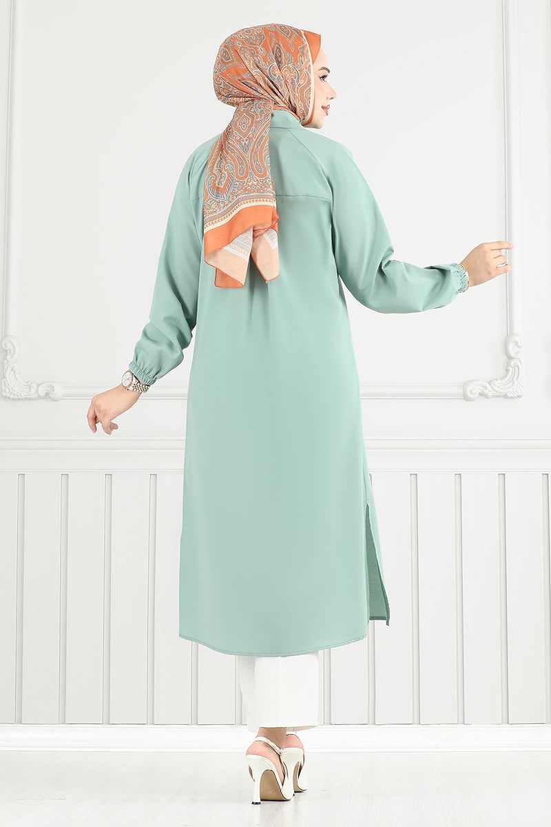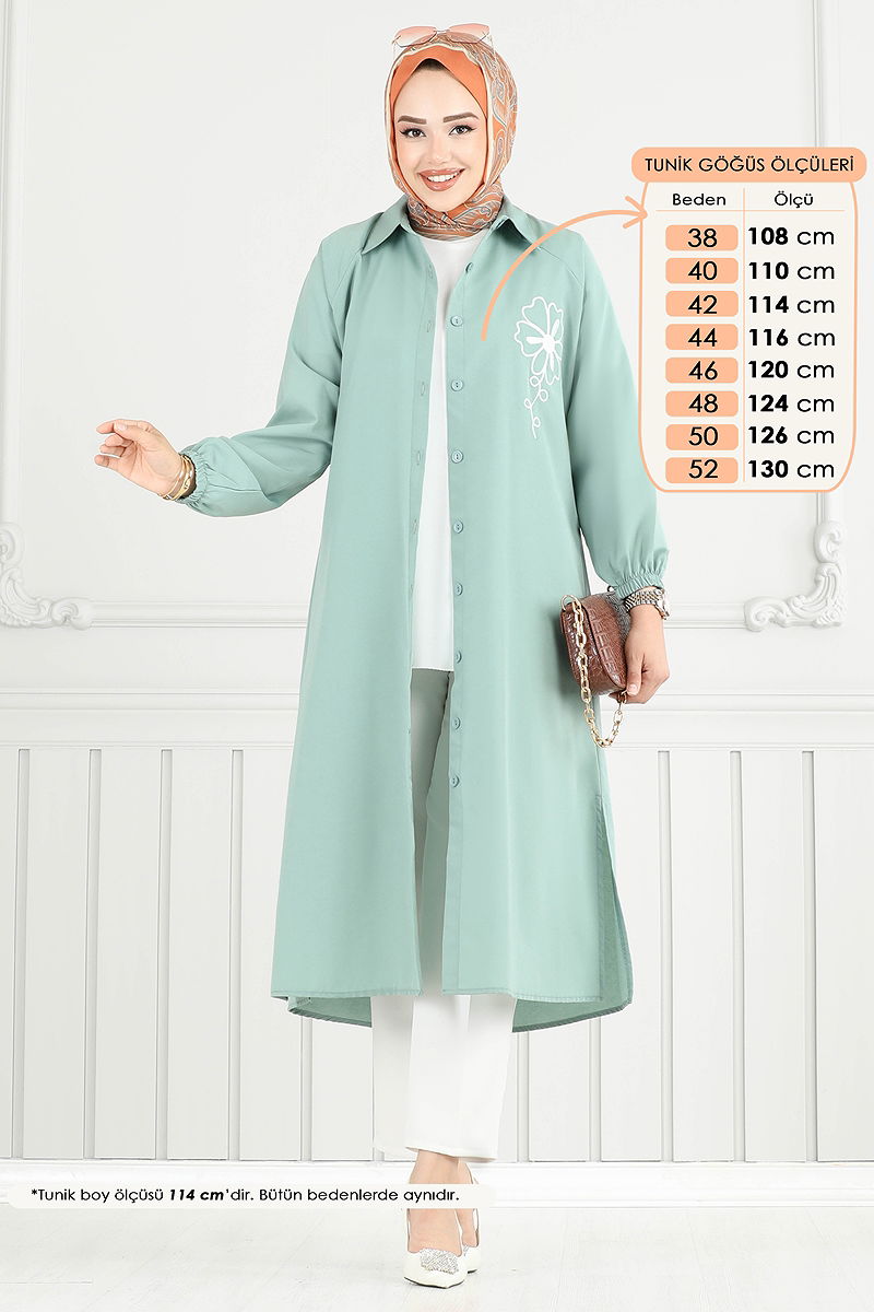 Product Feature : It is a new season hijab fashion product. The product has a Shirt collar. The product has From the front buttons. The tunic has a side slash.. Unlined. Embroidery details are sewn. The cuff is rubberized. There may be a tonal difference in the product due to concept photo shoots.