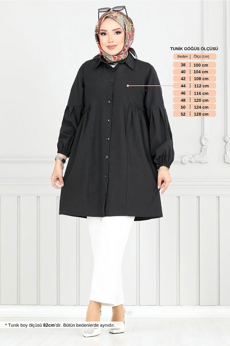 The Elastic Wrist Tunic is an ideal modest wear piece that can be used in all seasons. Made from terrycotton fabric, this stylish tunic offers both comfort and functionality. It features a shirt collar and a front button design for convenient wear. The elastic wrists allow for a comfortable fit, and it should be washed at 30 degrees on a gentle cycle. The product displayed is size 38 and is unlined. Perfect for maintaining elegance in any setting.