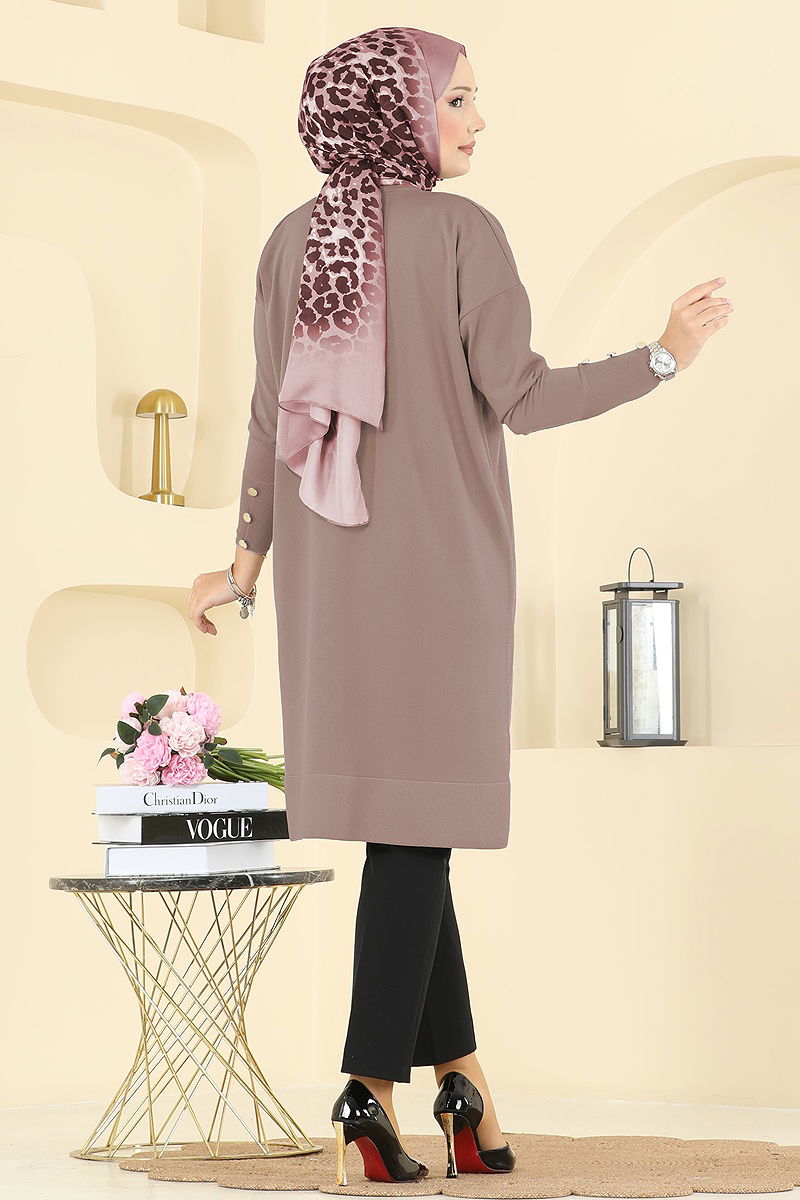 The Cuff Accessory Buttoned Knit Tunic is specially designed for those who prefer modest clothing. Ideal for autumn and winter use, this tunic can be washed at a gentle 30 degrees Celsius. With a crew neck design and a standard size structure (36-38-40-42-44-46), it fits most body types. The cuffs are adorned with buttons that serve as chic accessories. The use of mercerized knit fabric adds extra comfort and durability to the product.