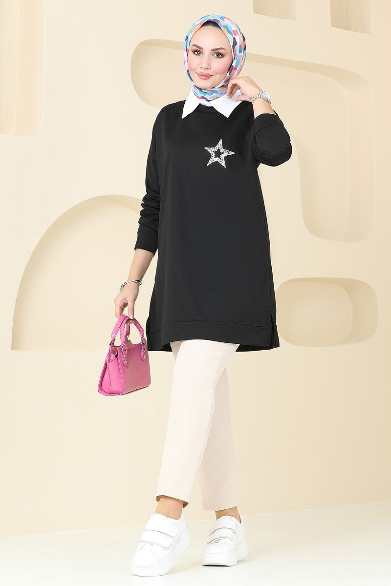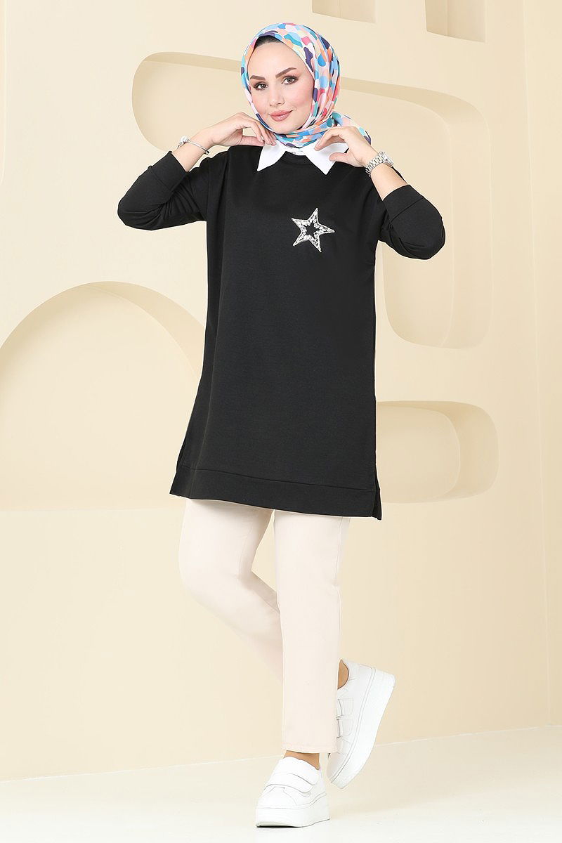 Product Feature : It is a new season hijab fashion product. The product has a Cycling collar. The tunic has a side slash.. Unlined.. The stones are glued. There may be a tonal difference in the product due to concept photo shoots.