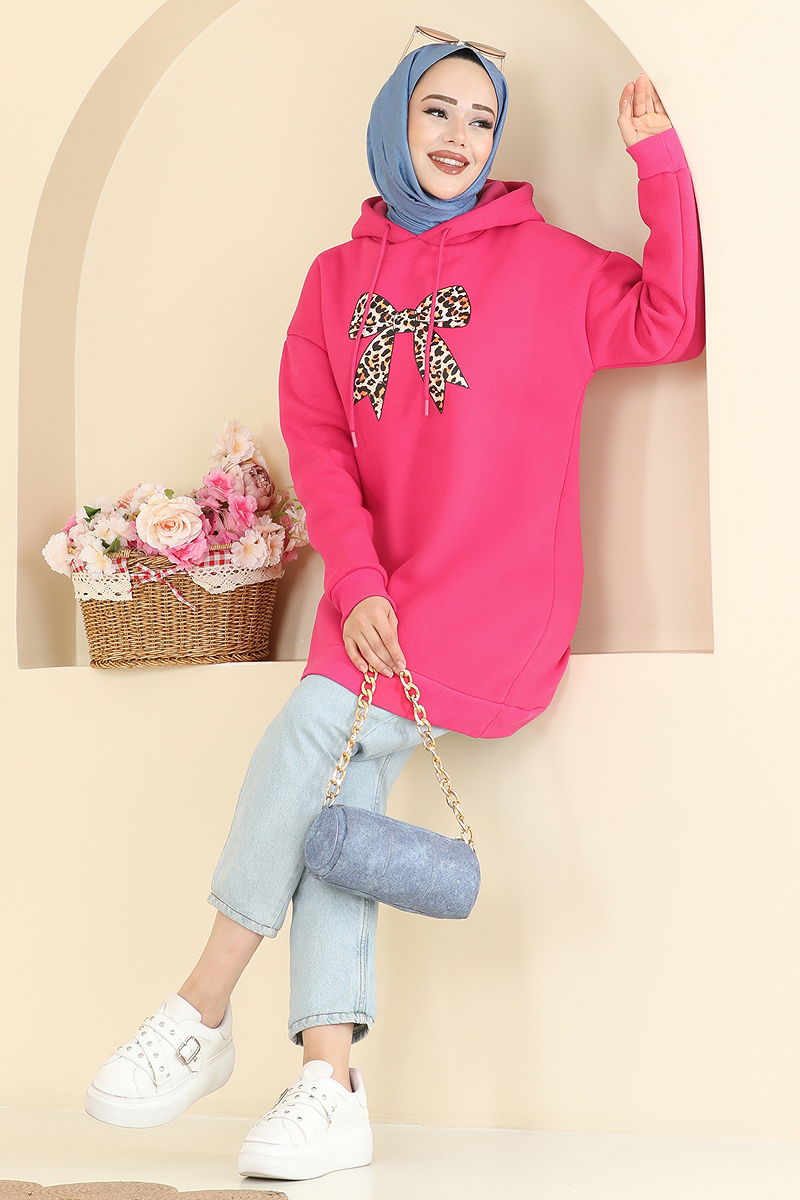 The Ribbon Pattern Three Thread Tunic is a stylish hijab tunic perfect for Autumn and Winter seasons. Made from quality three-thread fabric, it keeps you warm on chilly days, while its crew neckline and unlined design ensure comfort. This tunic stands out with its printed details and is presented in size M as a single piece. To extend the product's life, wash inside out and iron on the reverse side.