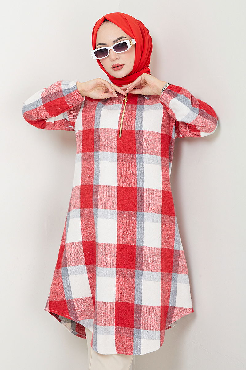 Half-Zip Plaid Tunic model is a hijab product that can be worn in Autumn and Winter. It should be washed at 30 degrees without squeezing. It is made of first-class Plaid fabric. The product has a shirt collar. It is unlined. (The product on the model is size 38.) It has a half zipper on the front that can be used.