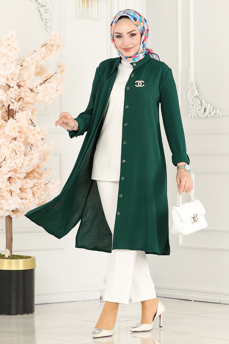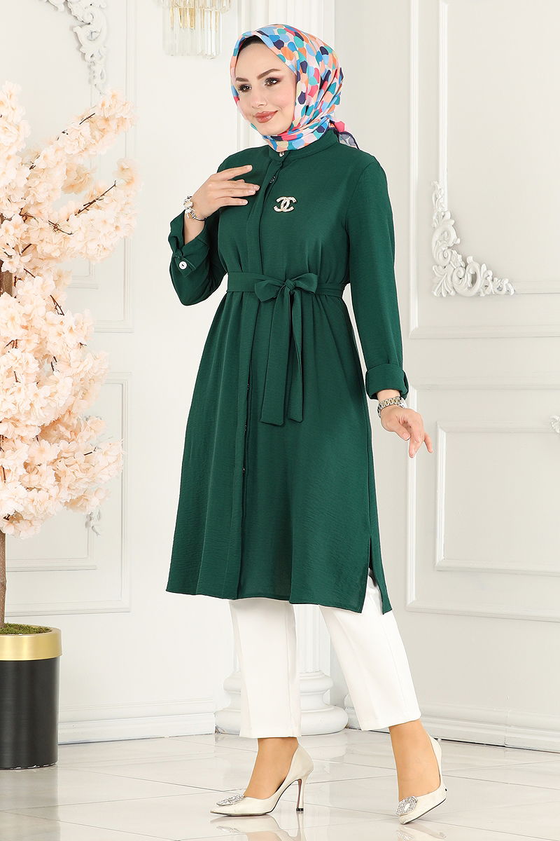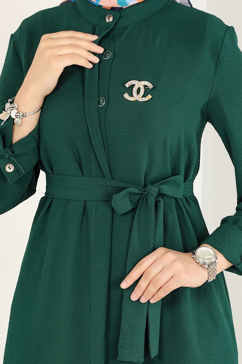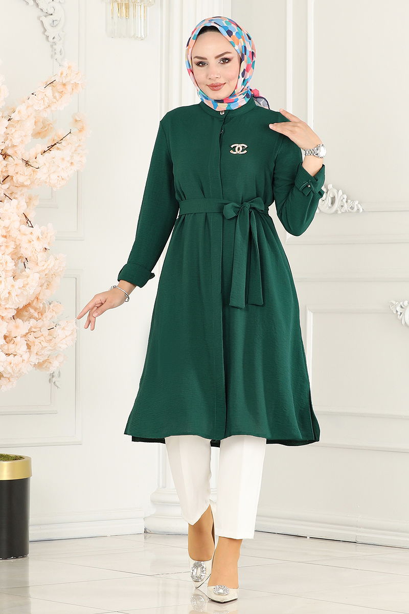 المنتج لديه ياقة نصف بيضوية. المنتج به أزرار من الأمام. غير مبطنة.. الحزام متضمن، ،يمكن استخدامها حسب الرغبة أزرار الكفة نشطة. قد يكون هناك اختلاف في الدرجة اللونية في المنتج بسبب التقاط الصور الفوتوغرافية.