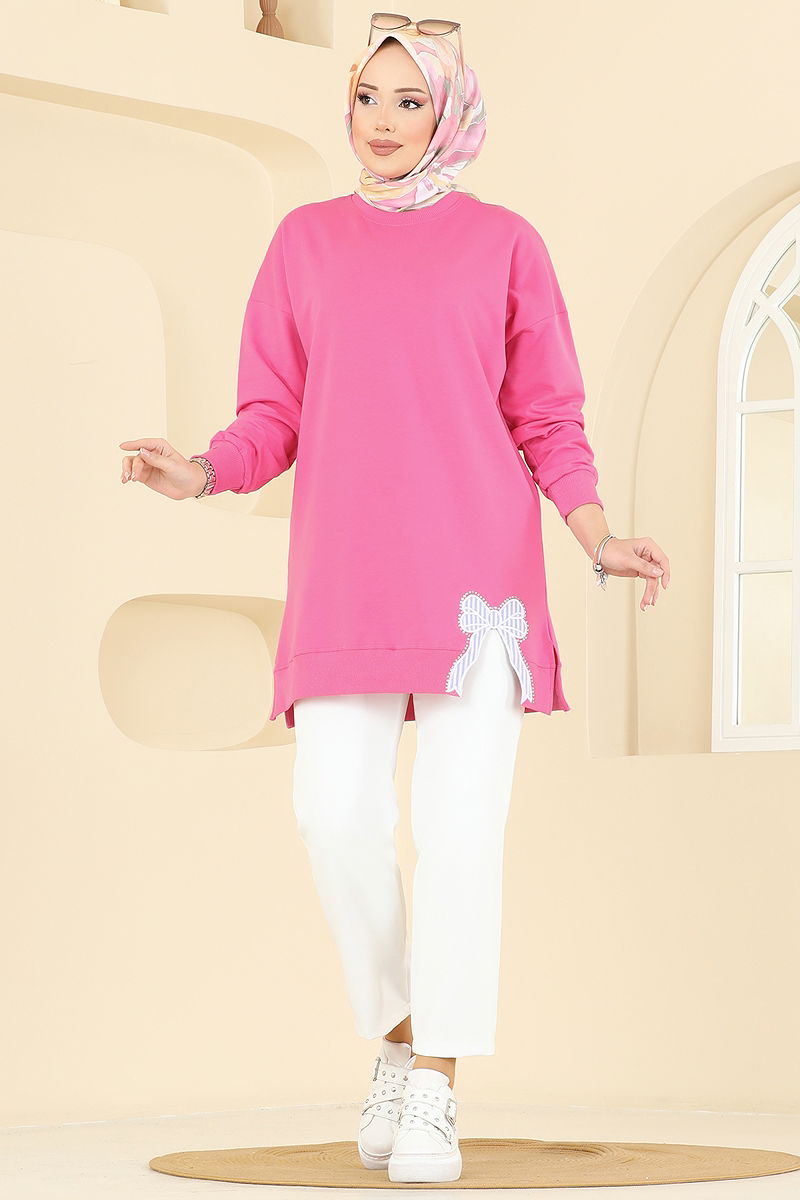 The Ribbon Slit Dual Yarn Tunic is a stylish modest wear that can be comfortably worn across all seasons. Made from dual yarn fabric, this tunic features a bicycle neck design and a front slit detail that captures attention. Its unlined structure offers a light and comfortable fit. It can be washed gently at 30 degrees Celsius. The product on the model is size S-M and is also available in different sizes.