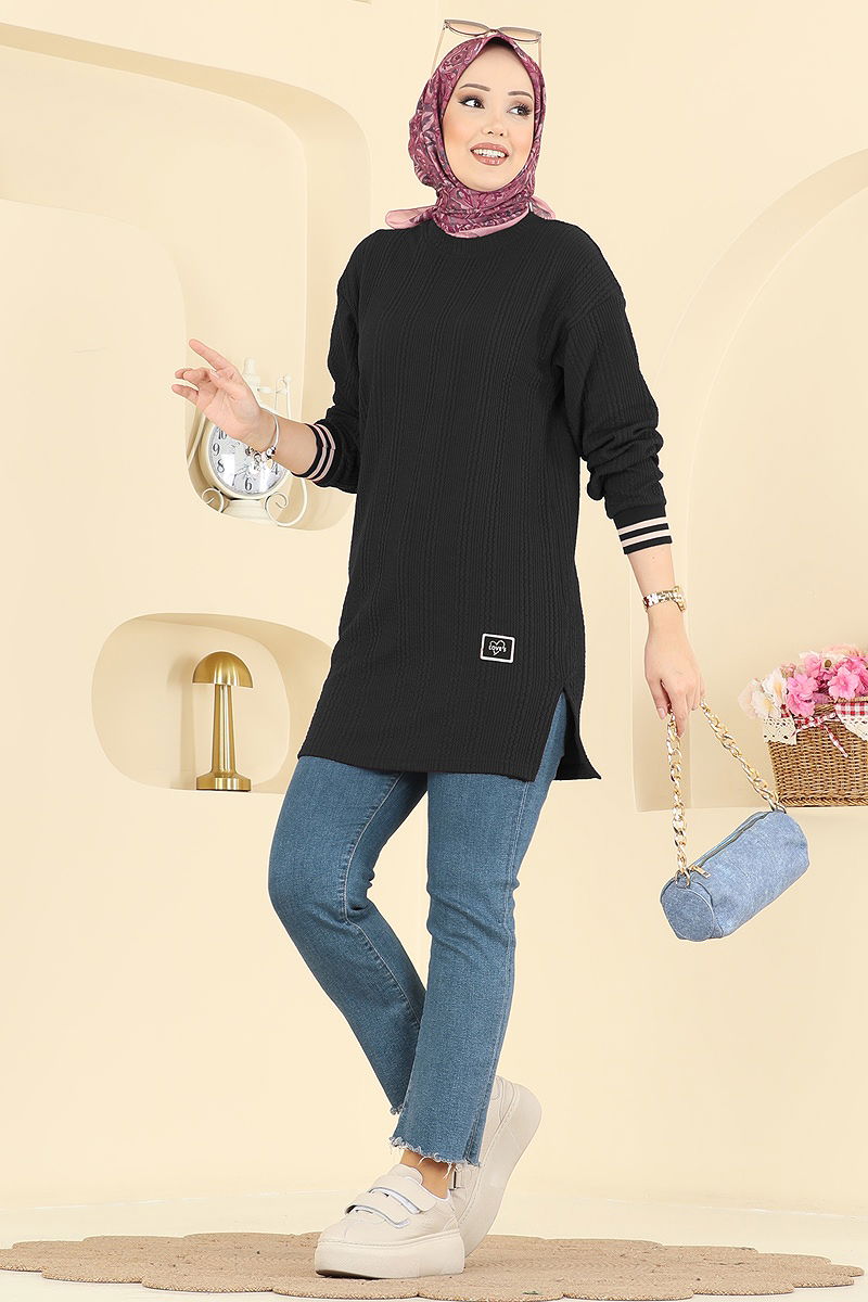 The Ribbed Cuff Detailed Tunic is an ideal modest wear with its unique design and comfortable structure, suitable for all seasons. It can be cleaned with a gentle wash at 30 degrees and features a braided fabric and mandarin collar, making the tunic both stylish and practical. Its side slits offer freedom of movement, and its unlined structure emphasizes lightness. The product displayed on the model is size 38.