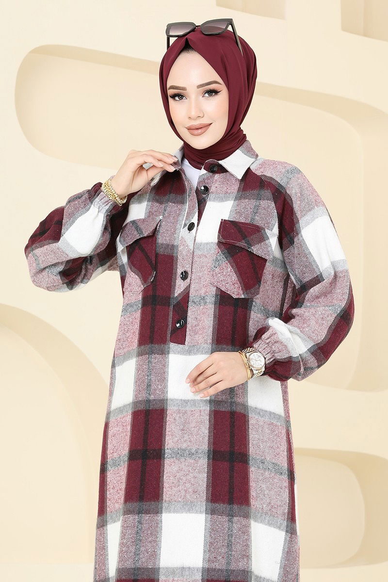 Half-Buttoned Plaid Tunic is a hijab model suitable for Autumn and Winter seasons. It can be washed at 30 degrees without squeezing.(DELICATE WASH) It is Plaid fabric. The product has a Shirt collar. The product can be used from the front and is half-buttoned. It is unlined.(The product on the model is size 38.) The cuff is elastic.