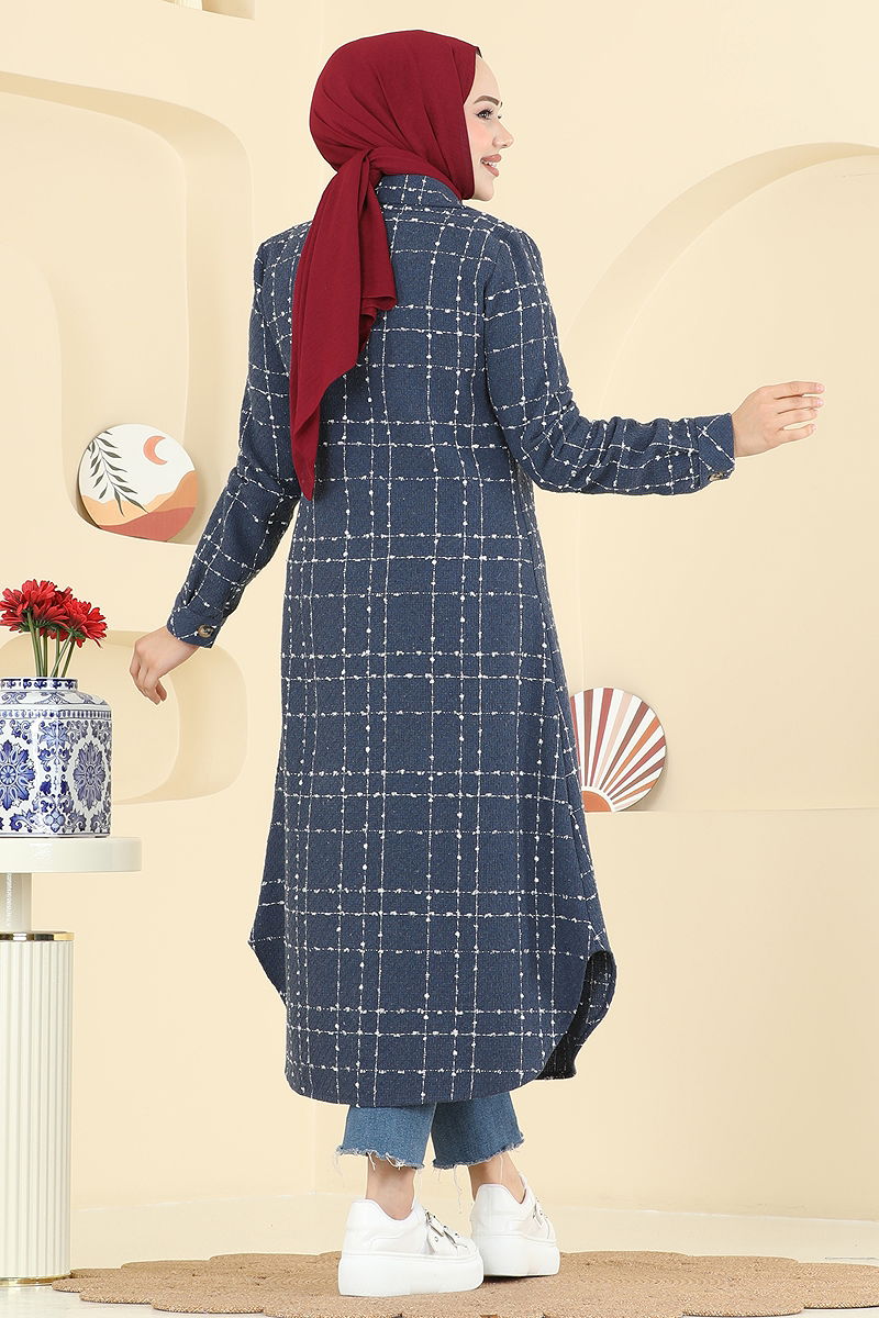 The Button-Front Tweed Tunic is an ideal modest wear for the autumn and winter seasons. This tunic, which can be washed delicately at 30 degrees, is made from durable tweed fabric. It offers an elegant look with its shirt collar and button-front design. The model displayed is a size 38, ensuring a fitted appearance. The active breast pocket and cuff buttons add both practicality and aesthetic detail.