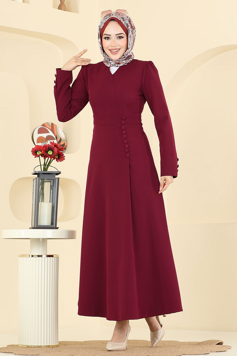 V Yaka Aksesuar Düğmeli Elbise 2754SL432 Bordo
