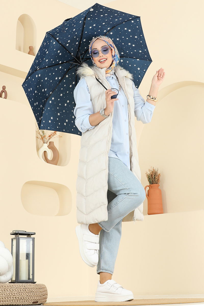 Hooded Fur Trimmed Hijab Vest model hijab product. Can be used in Autumn and Winter seasons. It should only be dry cleaned. It is made of first-class quilted fabric. The product has a Hooded collar. It is lined. The product is zippered from the front. Height: 160 cm, Chest: 86 cm, Waist: 68 cm, Hip: 95 cm, Weight: 52 kg. The fur is sewn to the product. The hood is included in the product, it may be used optionally. There is a pocket.