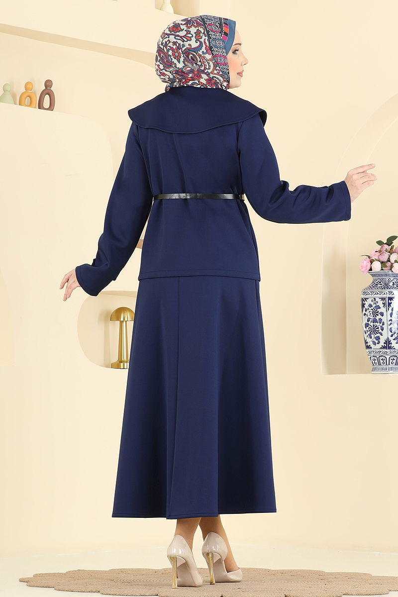 Ürün Adı: Yaka Detaylı Scuba Takım. Bu şık tesettür takımı, dört mevsim rahatlıkla kullanılabilir. Hassas yapısıyla 30 derecede yıkanabilir ve scuba kumaştan üretilmiştir. Bisiklet yaka ve önünden düğmeli tasarımıyla modern bir görünüm sunar. Astarsızdır ve M beden örneği üzerine uyarlanmıştır. Kemer, dalgalanmayı önleyecek şekilde tasarlanmıştır; iki ucu dikilmiş ve orta kısmı dikişsiz bırakılmıştır. Kemer, takıma dahil olup isteğe bağlı kullanılmayabilir. Etek beli lastiklidir ve etek ile ceket kombini, manşet düğmeleriyle şık bir aksesuar detayına sahiptir.