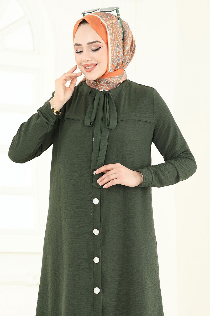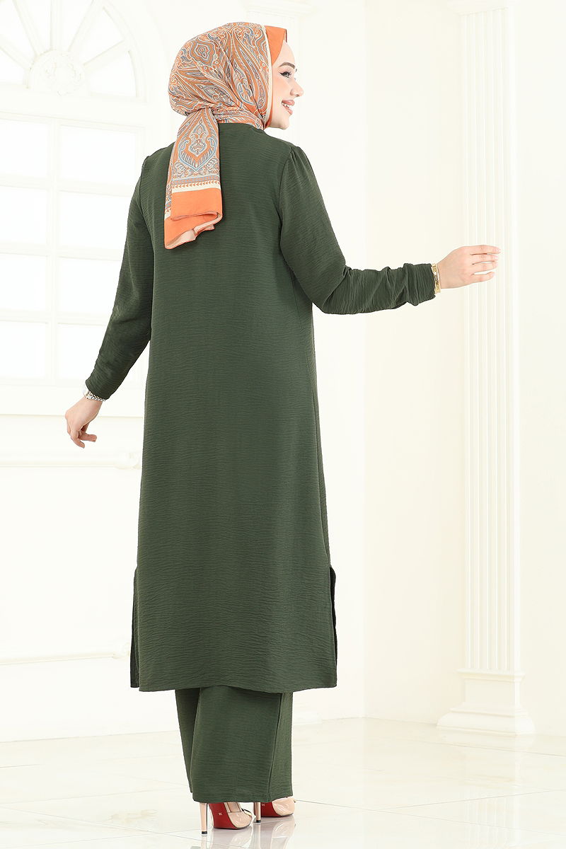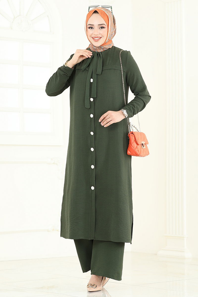 Ürün Özelliği : Yeni sezon tesettür moda ürünüdür. Ürün Fular yakadır. Ürün Önden düğmelidir. Tunik yandan yırtmaçlıdır.. Astarsızdır. Bağcık detayları aksesuardır. Bluz ürüne dahil değildir. Ürün kullanım amacını göstermek için bluz ile örnek kombin yapılmıştır. Pantolon beli lastiklidir. Konsept fotoğraf çekimlerinden dolayı üründe ton farklılığı olabilir.