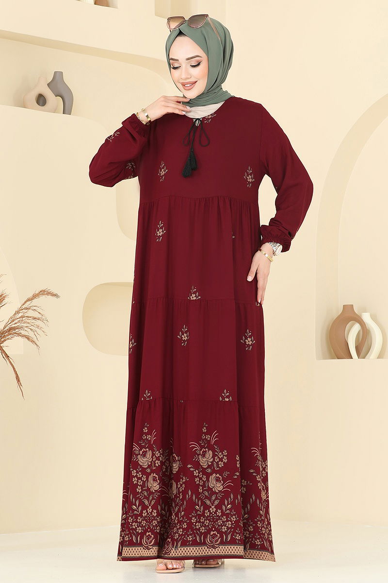 Yakası Bağcıklı Rahat Elbise 4095ZNNK1102 Bordo