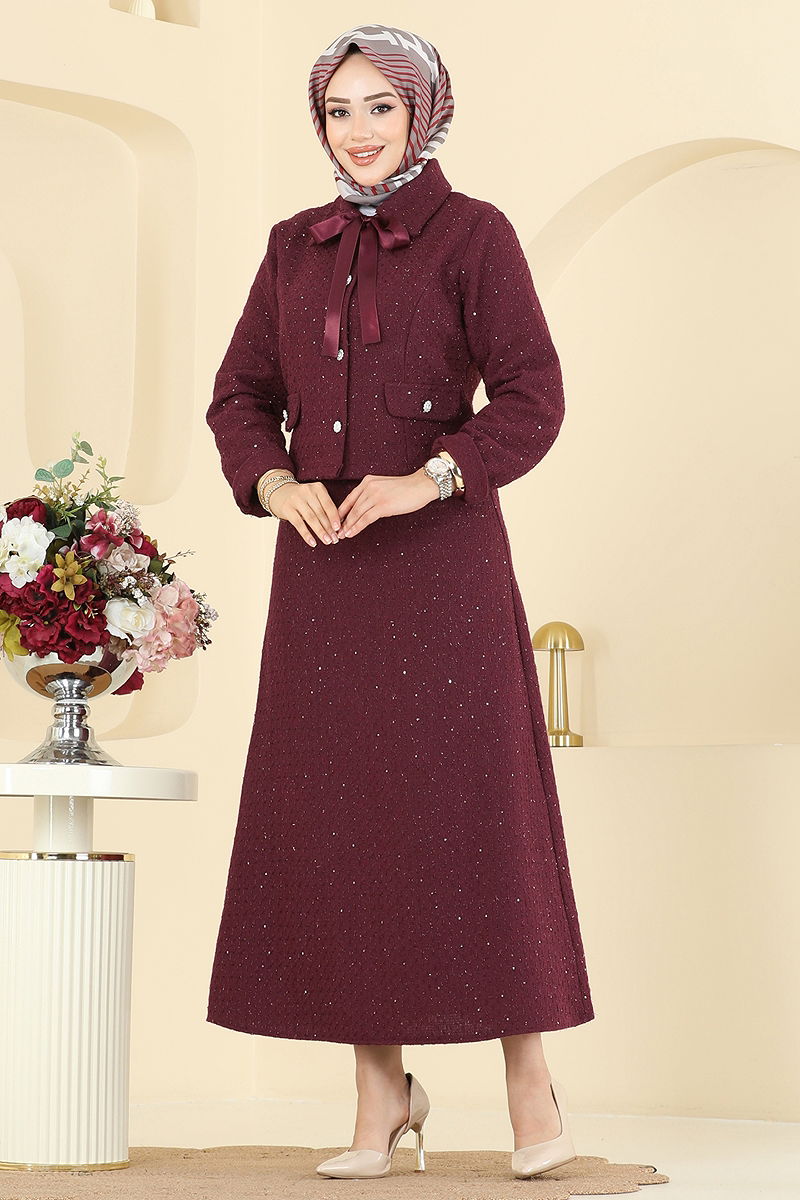 Yakası Bağcıklı Tüvit Takım Bordo