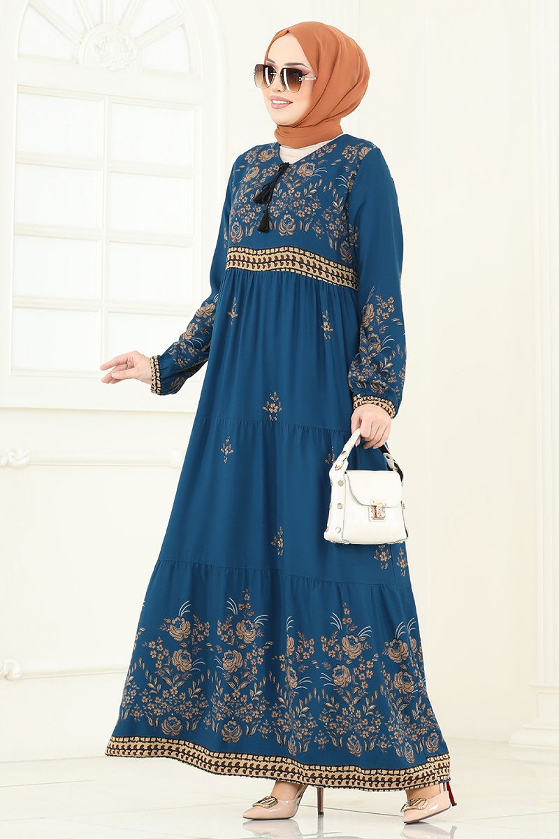 Yakası Bağcıklı Desenli Viskon Elbise model tesettür ürünüdür.Dört mevsim sezonunda kullanılabilir.Elde yıkama yapılmalıdır.Viskon kumaştan imal edilmiştir.Ürün V yakadır.Astarsızdır.(Modelin üzerindeki ürün 38 bedendir.)Boy: 160 cm, Göğüs: 82 cm, Bel: 68 cm Basen: 96 cm, Kilo: 53 kg. Manşet lastiklidir.