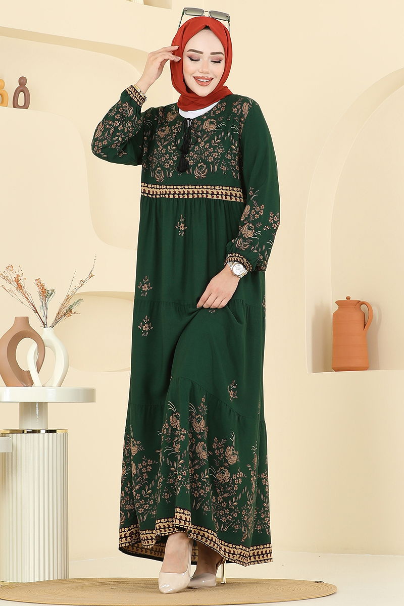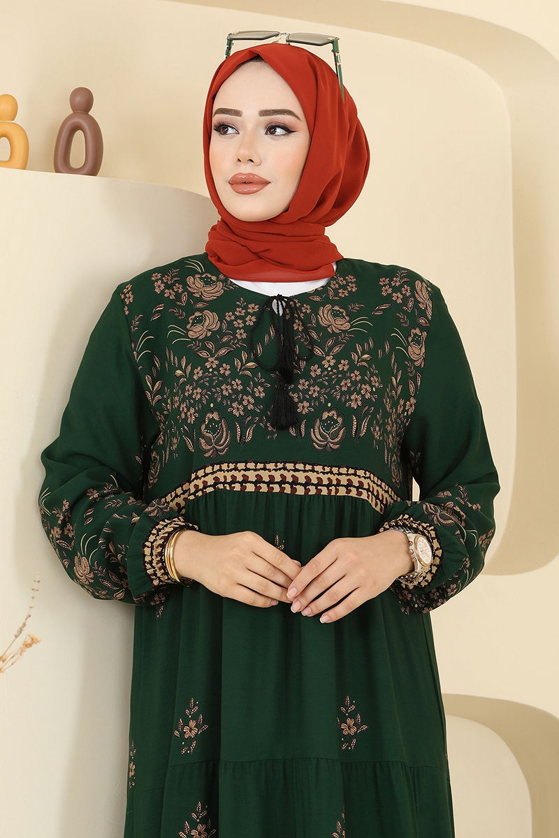 Yakası Bağcıklı Viskon Elbise 5013ERK1158 Zümrüt