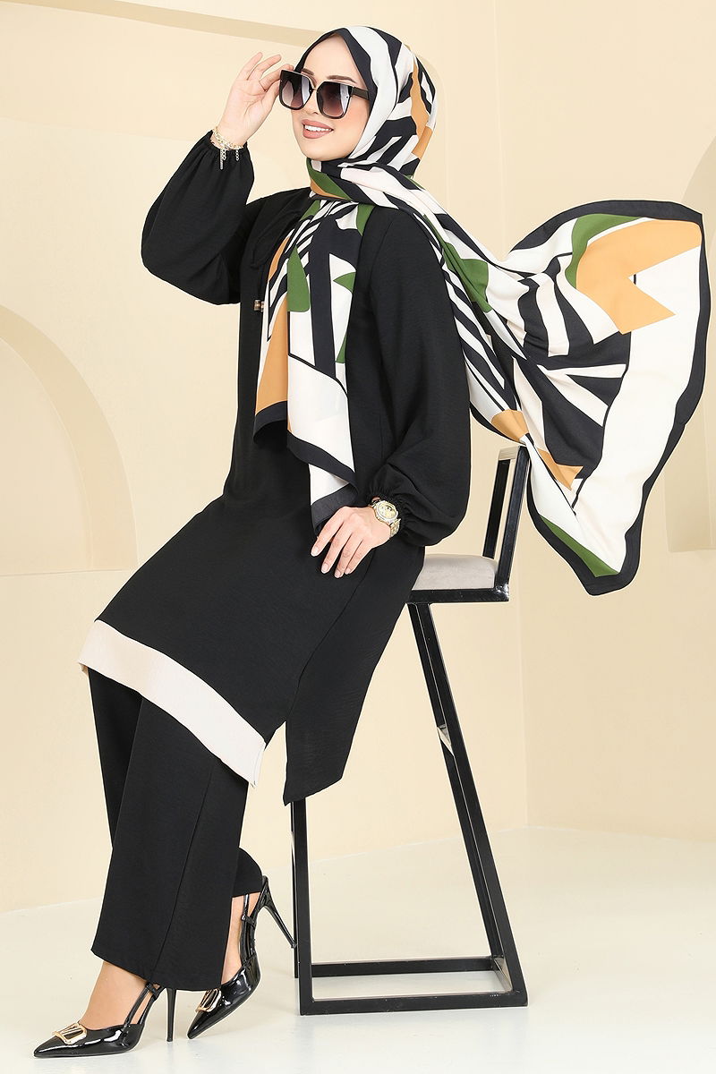 Product Feature : It is a new season hijab fashion product. It has a button that can be used from the back. The product has a Cycling collar. The product has from the back buttons. The tunic has a side slash.. Unlined. The waist of the trousers is elastic. The cuff is rubberized. There may be a tonal difference in the product due to concept photo shoots.