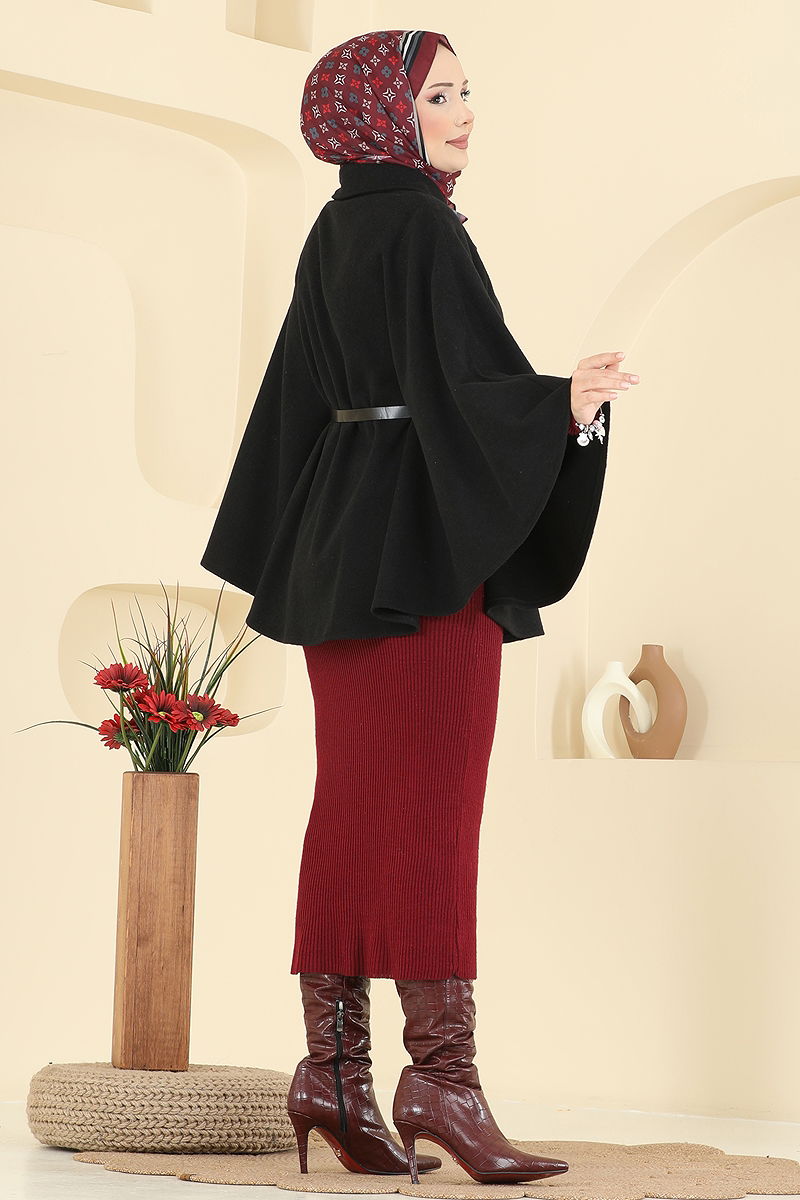 Yakası Düğmeli Kaşe Panço Siyah