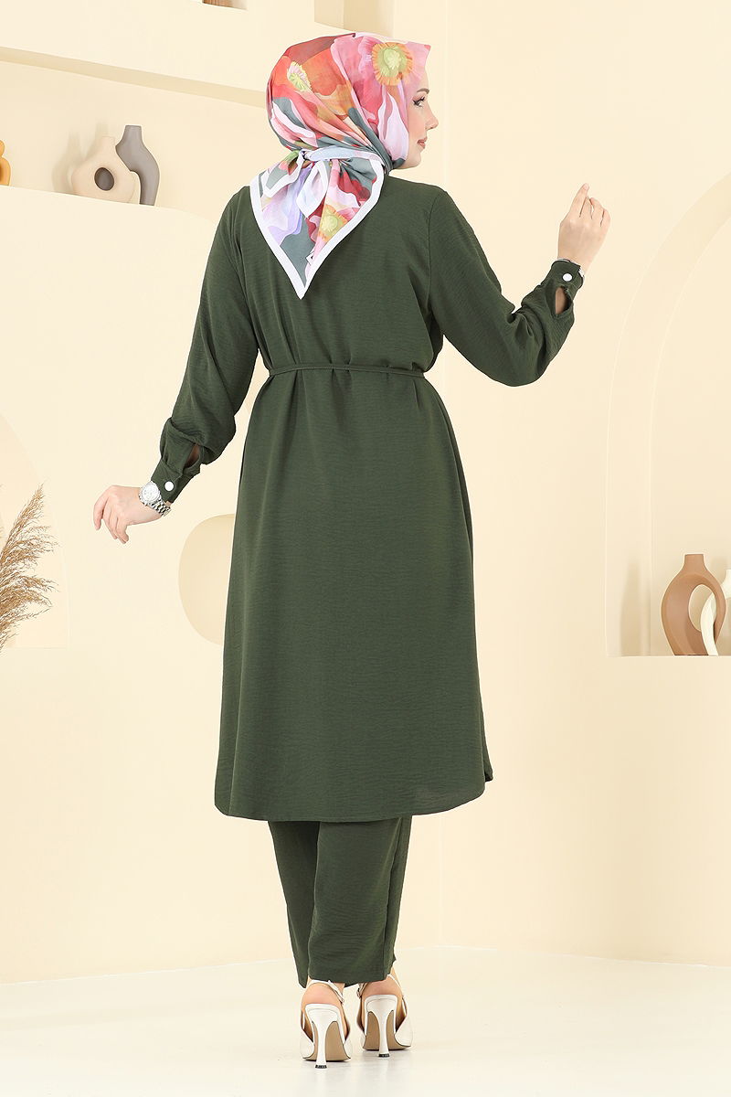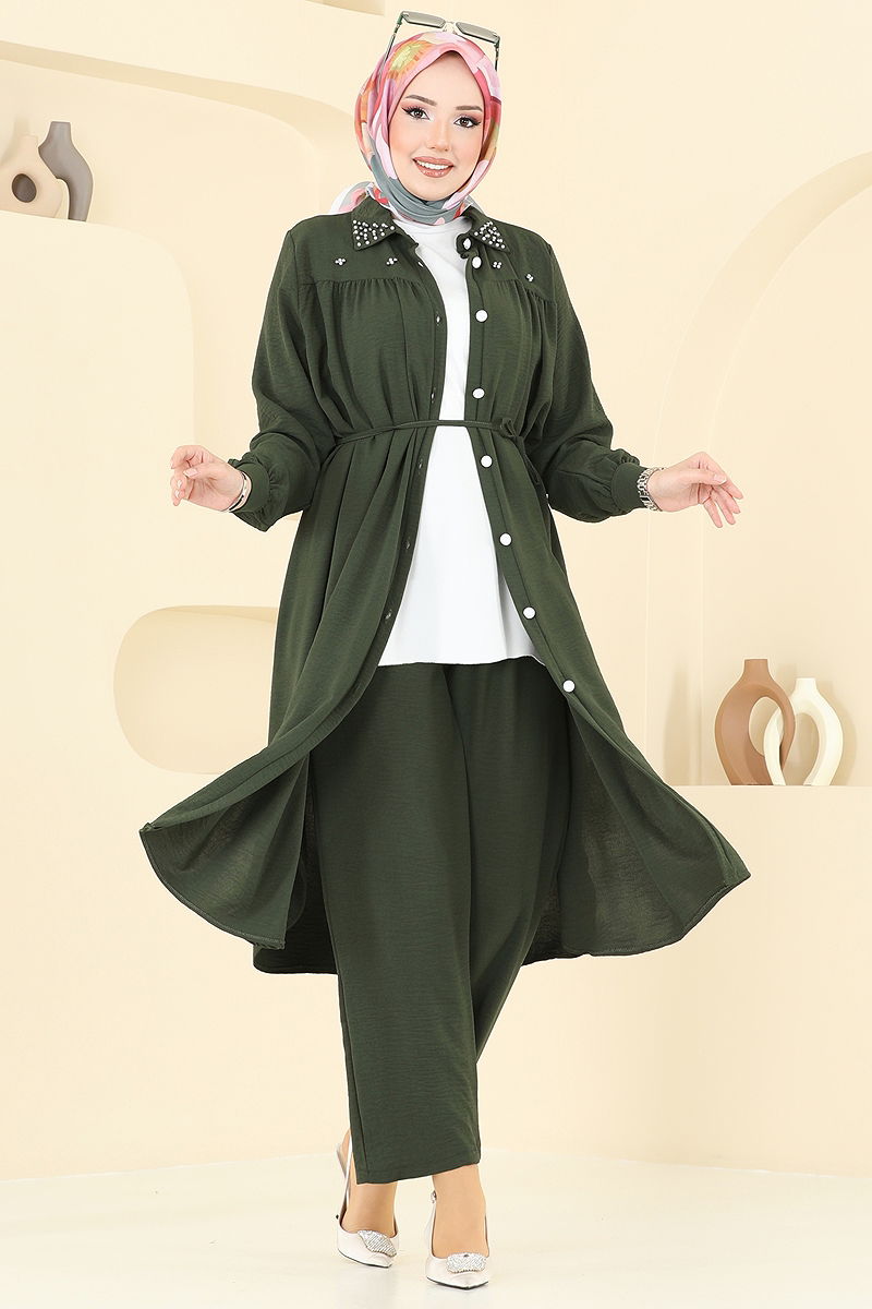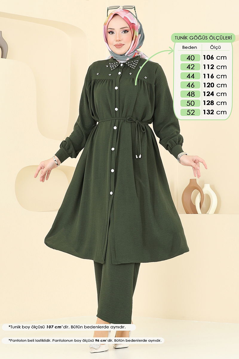 Ürün Özelliği : Yeni sezon tesettür moda ürünüdür. Ürün Gömlek yakadır. Ürün Önden düğmelidir. Tunik yandan yırtmaçlıdır.. Astarsızdır. İnci detayları çakımdır. Kemer ürüne dahildir, isteğe bağlı kullanılmayabilir. Bluz ürüne dahil değildir. Ürün kullanım amacını göstermek için bluz ile örnek kombin yapılmıştır. Pantolon beli lastiklidir. Manşet düğmeleri aktiftir. Konsept fotoğraf çekimlerinden dolayı üründe ton farklılığı olabilir.