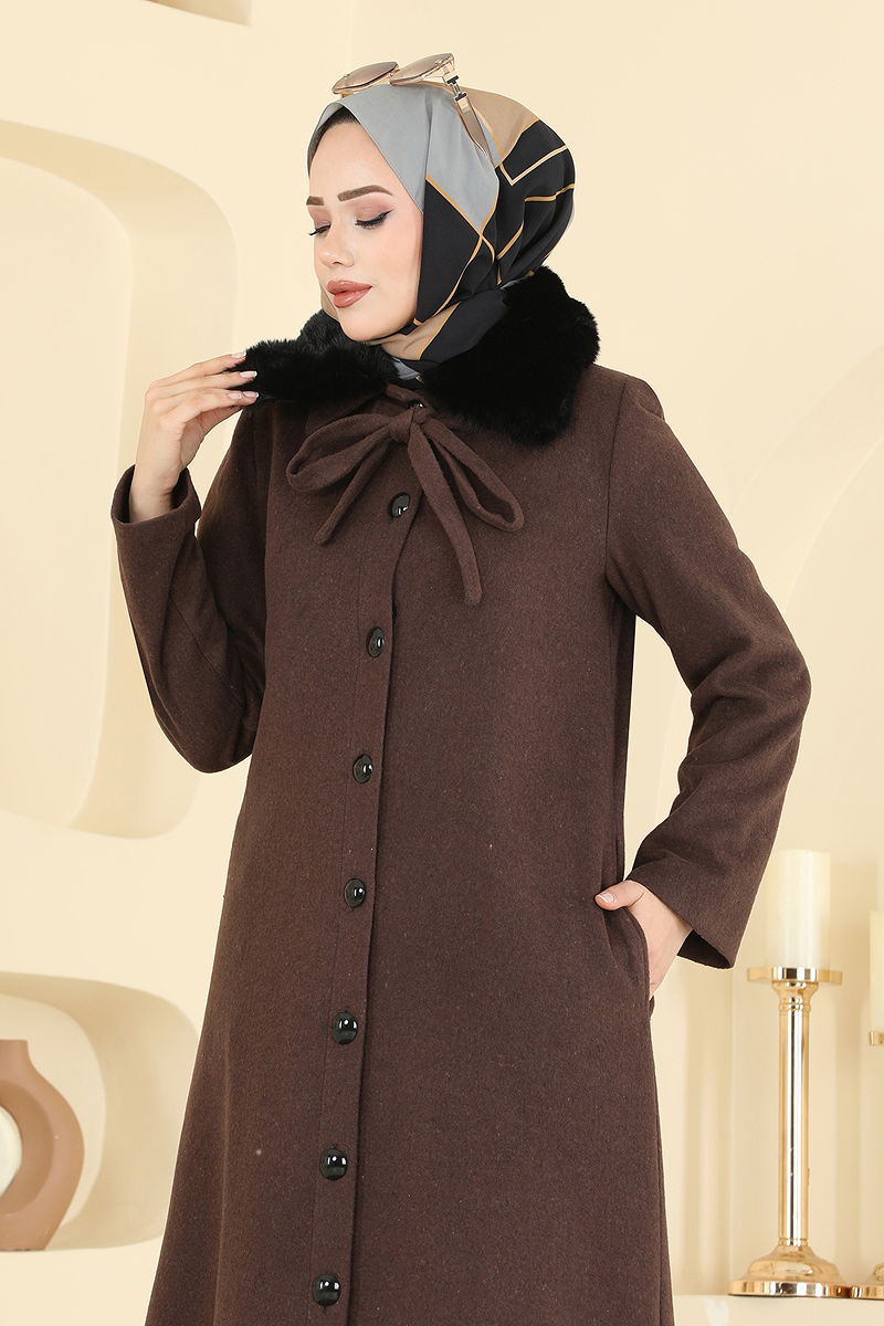 Yakası Kürk Detaylı Kaşe Kaban Kahve