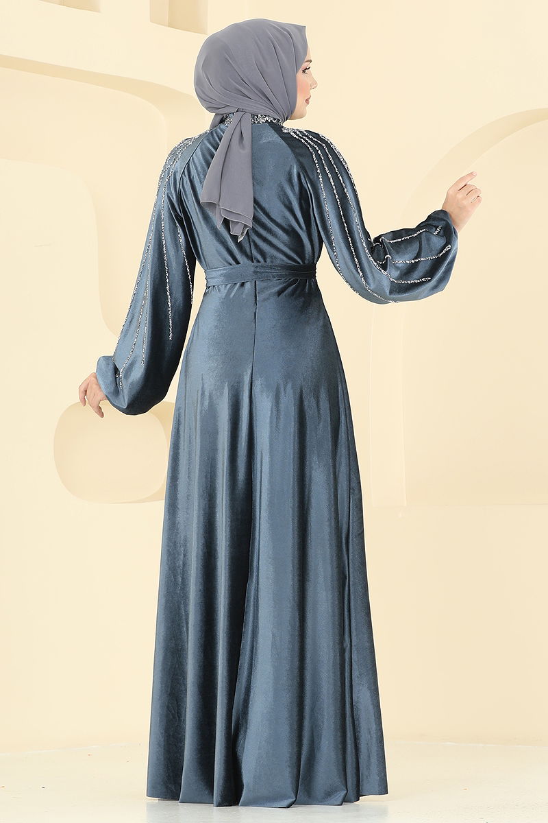 Yakası Taş Detaylı Kadife Elbise 5709EDF311 Antrasit