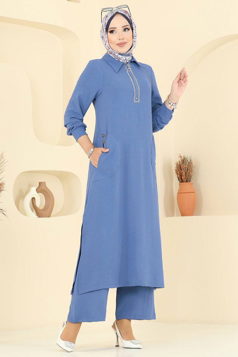 Yakası Taş Detaylı Tunik Takım İndigo