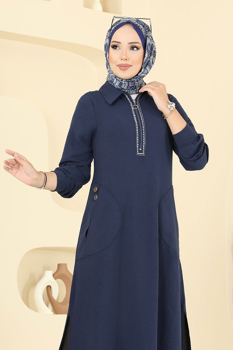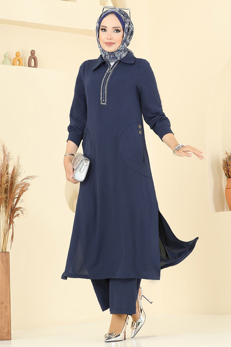 Product Feature : It is a new season hijab fashion product. There is a half zipper that can be used from the front. The product has a Shirt collar. The tunic has a side slash.. The stones are glued. The waist of the trousers is elastic. There may be a tonal difference in the product due to concept photo shoots.