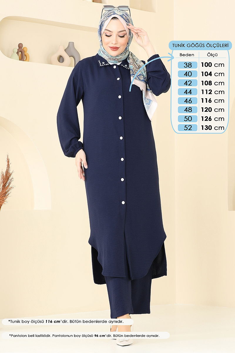 Ürün Özelliği : Yeni sezon tesettür moda ürünüdür. Ürün Gömlek yakadır. Ürün Önden düğmelidir. Astarsızdır. Taş detayları çakımdır. İnci detayları çakımdır. Pantolon beli lastiklidir. Manşeti lastiklidir. Konsept fotoğraf çekimlerinden dolayı üründe ton farklılığı olabilir.