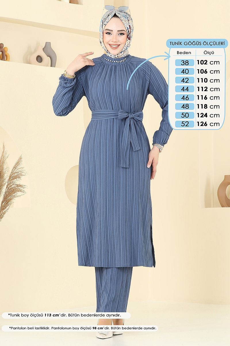 Yakası Taşlı Tesettür Takım, dört mevsim kullanabileceğiniz, krinkıl kumaştan imal edilmiş şık bir kombindir. Hassas yıkama ile 30 derecede yıkanabilir özelliği, rahat kullanımı sağlar. Tunik, yandan yırtmaçlı olup, hakim yakaya sahiptir ve astarsızdır. Pantolon, beli lastikli ve manşetler elastik olduğundan konforlu bir oturuş sunar. Tunikte sırt kısmında kullanılan düğme ve çakılmış taş detayları ile dikkat çekici bir görünüm kazanmıştır.