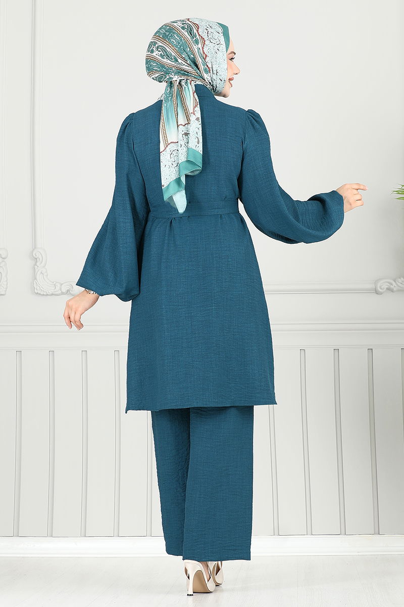 Yakası Taşlı Tesettür Takım 9038S324 Petrol