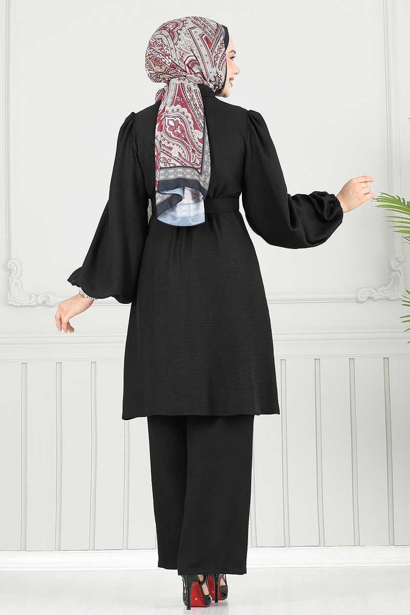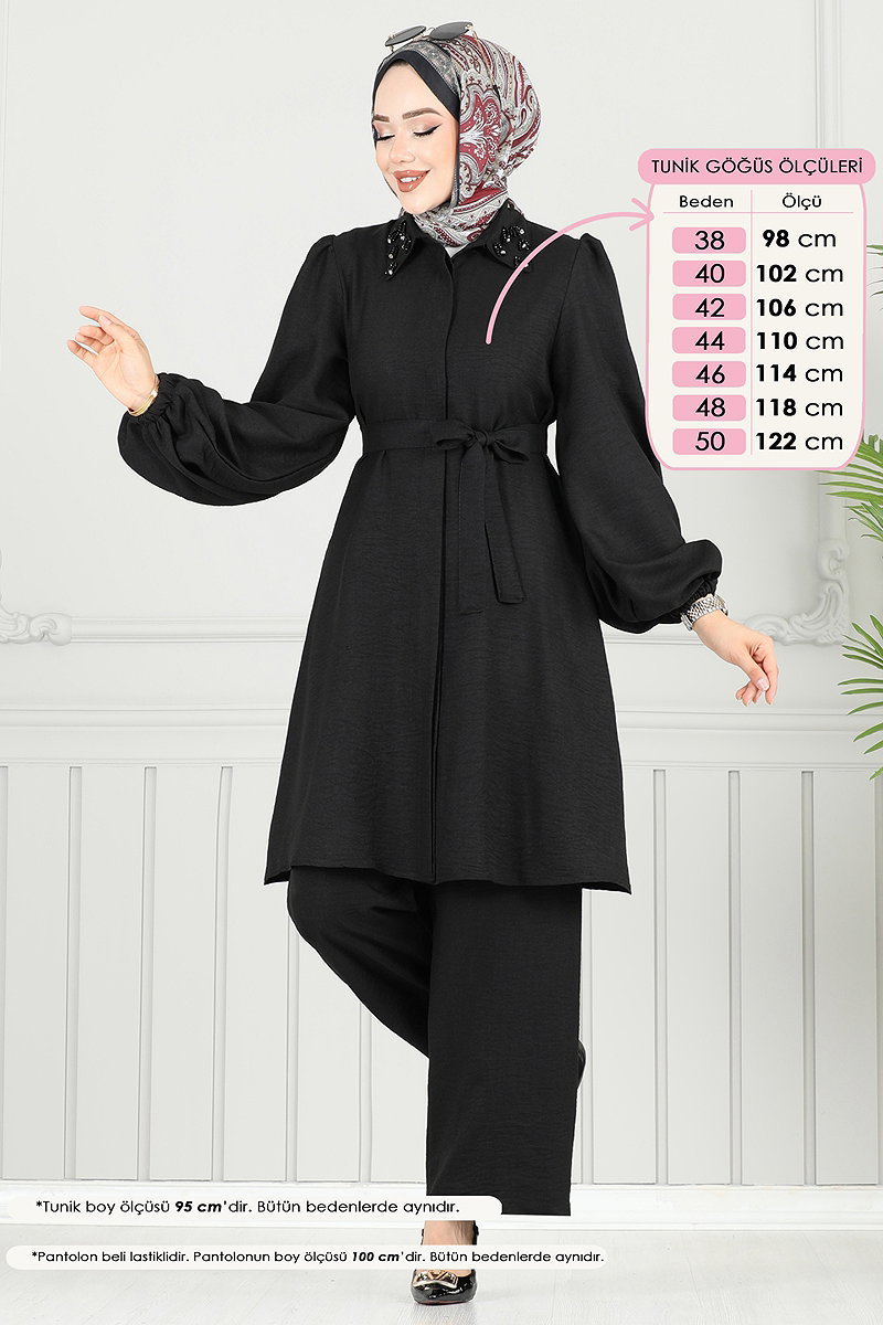 Yakası Taşlı Tesettür Takım Siyah