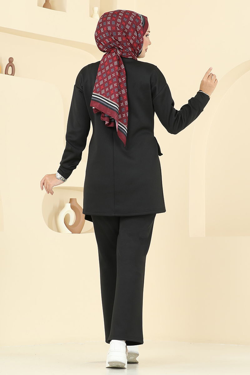 Yandan bağcık detaylı ve bisiklet yakaya sahip Scuba Takım KOMBİN, tesettür giyim için ideal bir seçenektir. Dört mevsim rahatlıkla kullanılabilen bu takım, hassas yıkama ile 30 derecede yıkanabilir özelliğe sahiptir. Scuba kumaştan üretilmiştir ve yan kısımda ayarlanabilir kemeri bulunmaktadır. Hem tunik hem de yarım lastikli beli olan pantolonu ile konfor ve şıklık bir arada sunar. Manken üzerindeki ürün 38 bedendir.