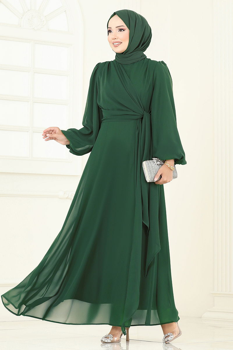 Yandan Bağcıklı Abiye Elbise Koyu Zümrüt