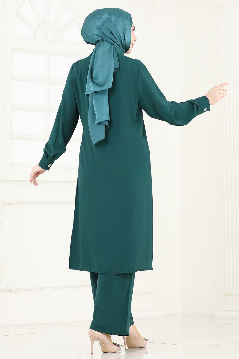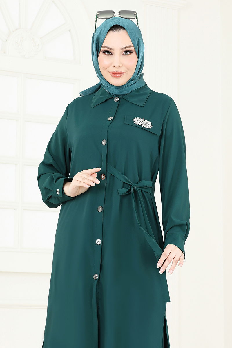 Ürün Özelliği : Yeni sezon tesettür moda ürünüdür. Ürün Gömlek yakadır. Ürün Önden düğmelidir. Tunik yandan yırtmaçlıdır.. Astarsızdır. Kemer Ürüne Dikilidir. Taşlar yapıştırmadır. Bluz ürüne dahil değildir. Ürün kullanım amacını göstermek için bluz ile örnek kombin yapılmıştır. Cep detayı aksesuardır. Pantolon beli lastiklidir. Manşet düğmeleri aktiftir. Konsept fotoğraf çekimlerinden dolayı üründe ton farklılığı olabilir.