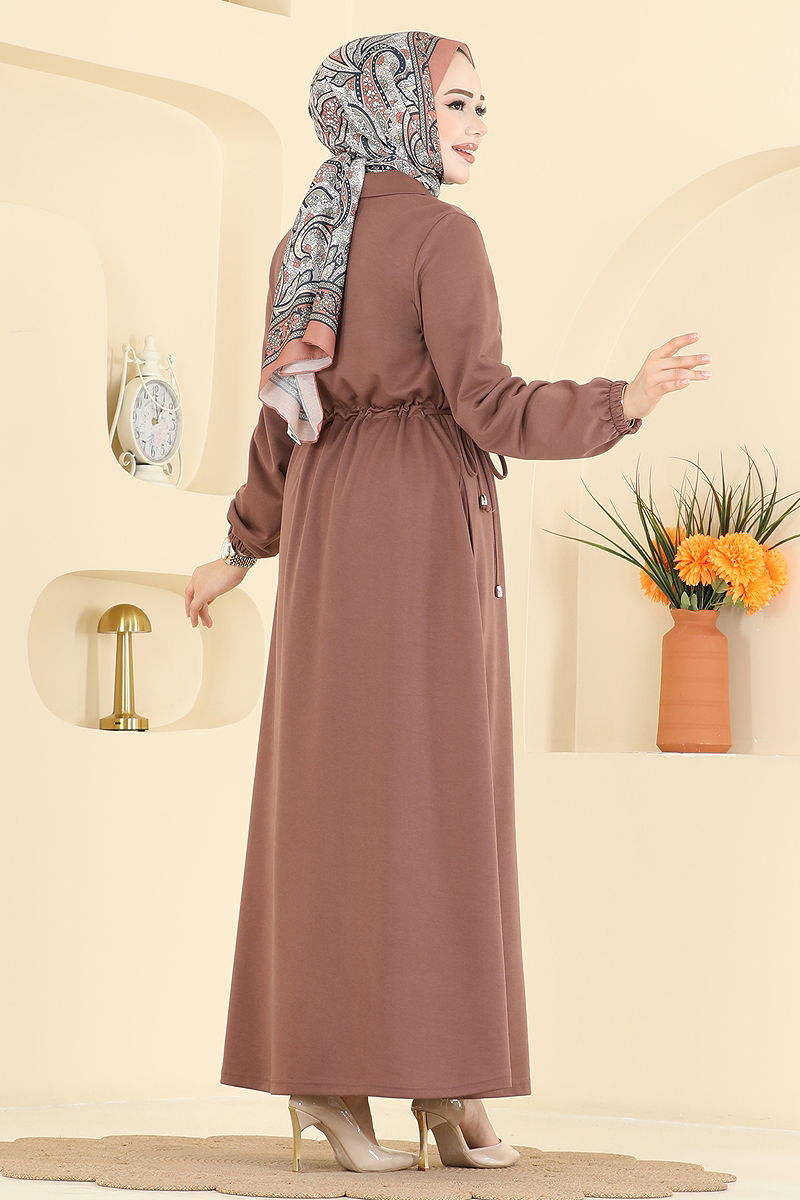 Yandan Bağcıklı İki İplik Elbise, dört mevsim kullanabileceğiniz şık ve konforlu bir tesettür modelidir. Hassas yapıdaki iki iplik kumaştan üretilen bu elbise, 30 derecede hassas yıkama ile temizlenebilir. Yandan ayarlanabilir bağcıkları sayesinde farklı vücut tiplerine uyum sağlar. Ön yarım fermuarı ve manşet lastikleri ise hem pratiklik hem de şıklık katar. Dik yaka ve astarsız tasarımı ile modern bir görünüm sunar. Modelin üzerindeki ürün 38 bedendir.