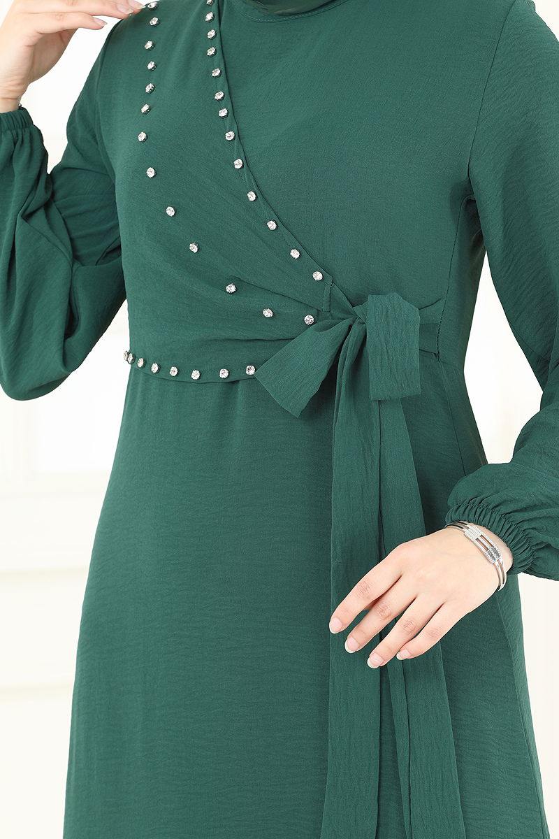 Yandan Bağcıklı Taşlı Elbise Zümrüt