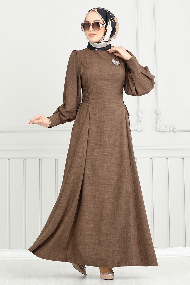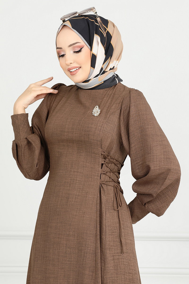 Yandan Bağcıklı Tesettür Elbise Açık Kahve