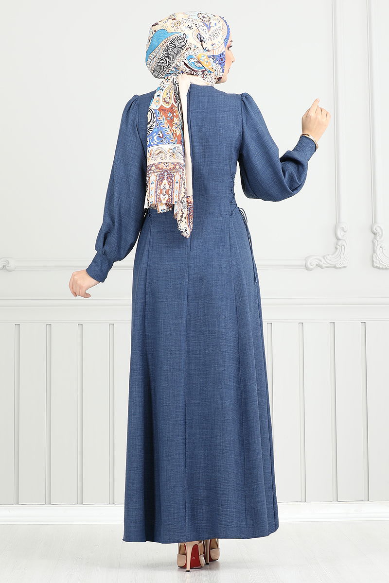 Yandan Bağcıklı Tesettür Elbise İndigo