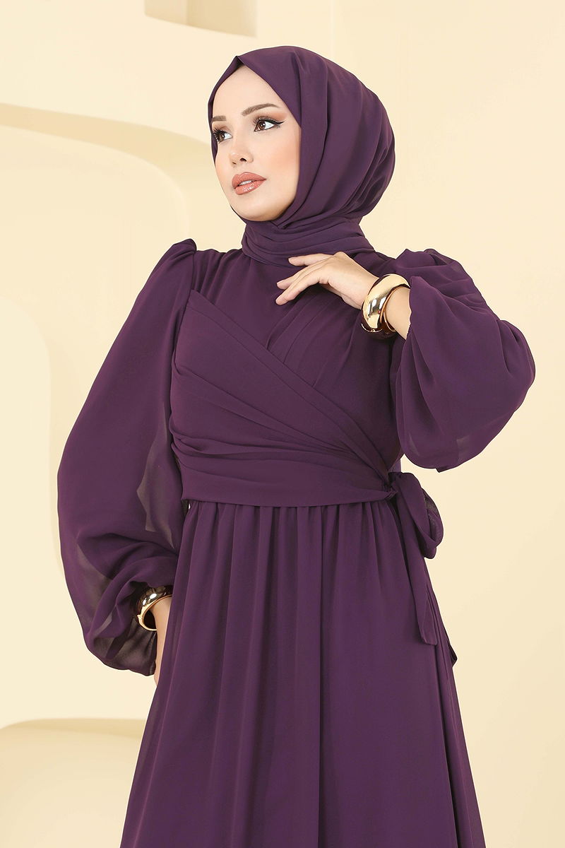 Yandan Bağlamalı Şifon Abiye Mürdüm