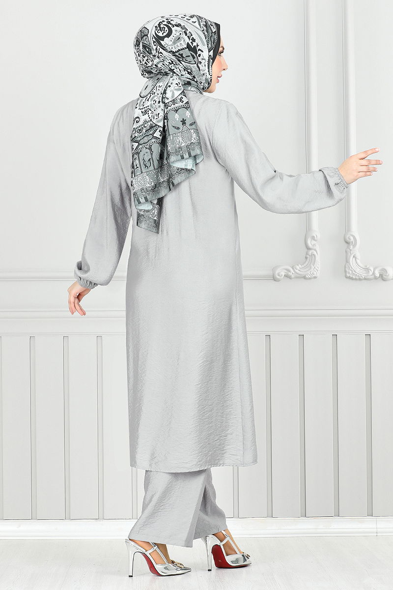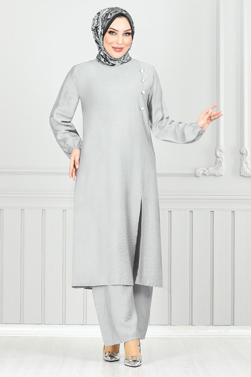 Yandan Düğmeli Tesettür Takım 4075PM1063-M Gri