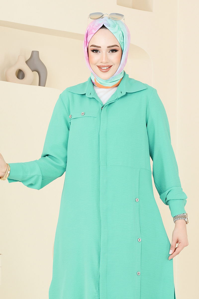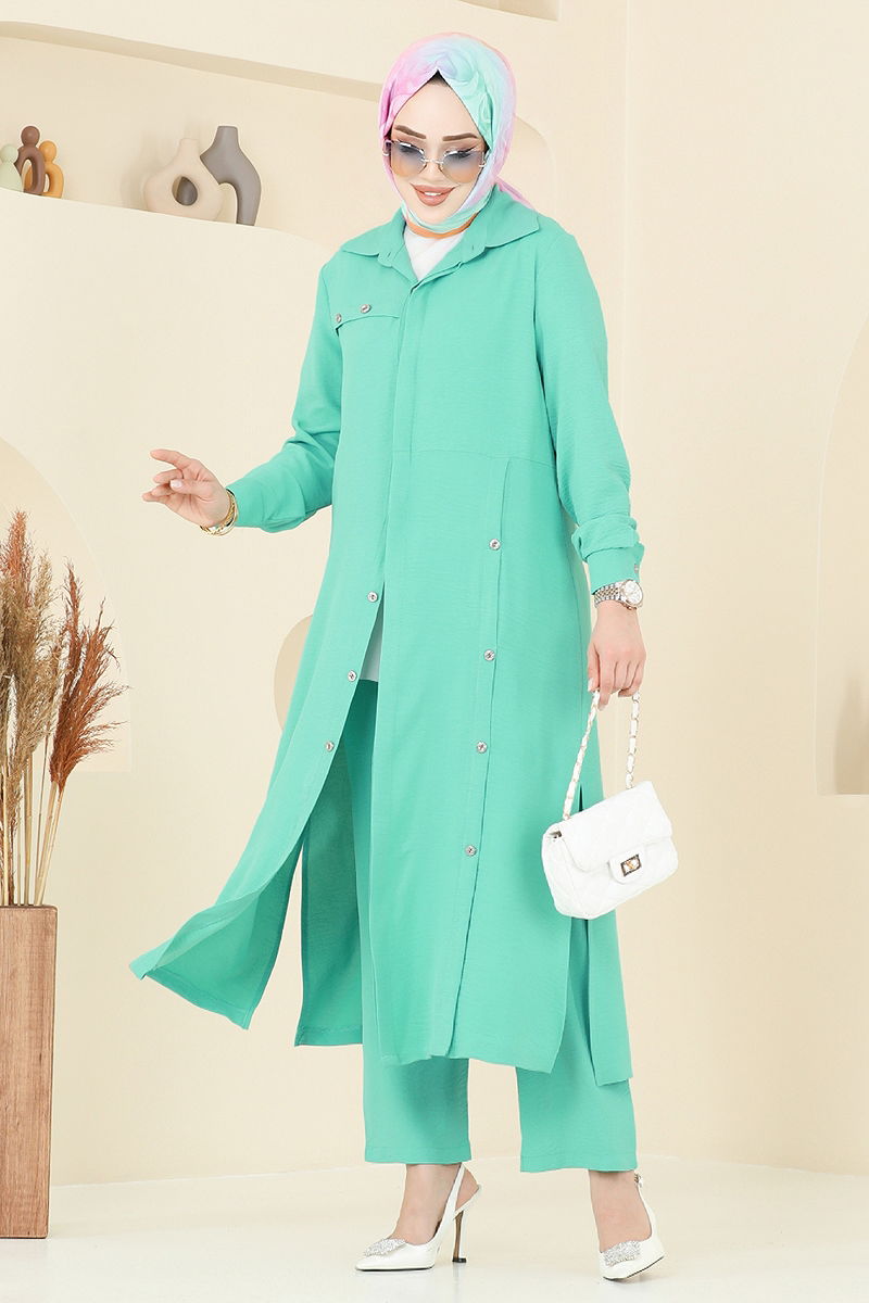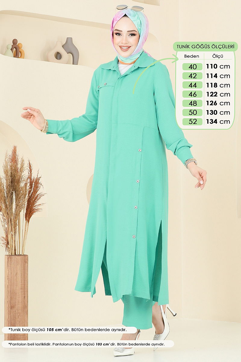 Ürün Özelliği : Yeni sezon tesettür moda ürünüdür. Ürün Gömlek yakadır. Ürün Gizli düğmelidir. Yırtmaç düğmeleri aksesuardır.. Astarsızdır. Düğmeler aksesuardır. Bluz ürüne dahil değildir. Ürün kullanım amacını göstermek için bluz ile örnek kombin yapılmıştır. Cep mevcuttur. Pantolon beli lastiklidir. Manşet düğmeleri aktiftir. Konsept fotoğraf çekimlerinden dolayı üründe ton farklılığı olabilir.