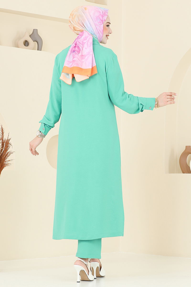 Yandan Yırtmaçlı Aerobin Takım, tesettür tarzına özel modeli ile dört mevsim rahatlık sağlar. Hassas yıkanabilen ve 30 derecede yıkanabilme özelliğiyle pratik kullanım sunan bu takım, aerobin kumaştan üretilmiştir. Gizli düğme detayları ve aksesuar olarak eklenen yırtmaç düğmeleriyle şıklığı artırırken, elastik pantolon beli konforu artırır. Astarsız yapısı ve aktif manşet düğmeleri ile hem şık hem de kullanışlı bir gardırop parçasıdır.