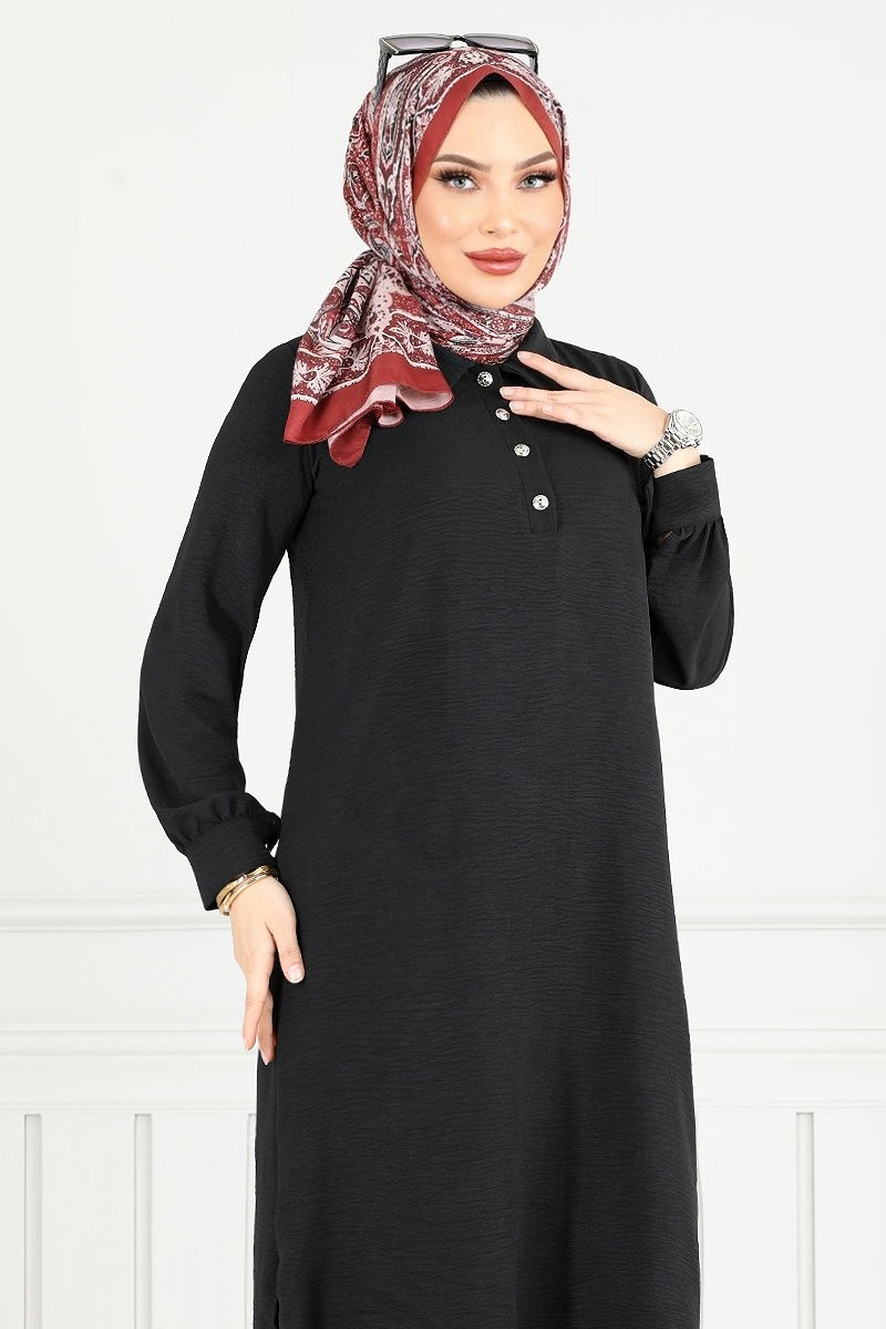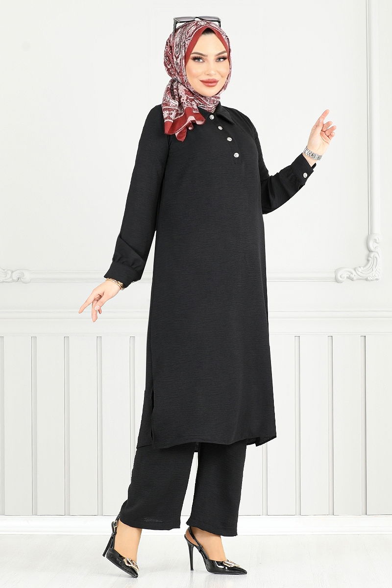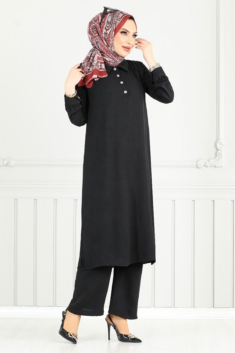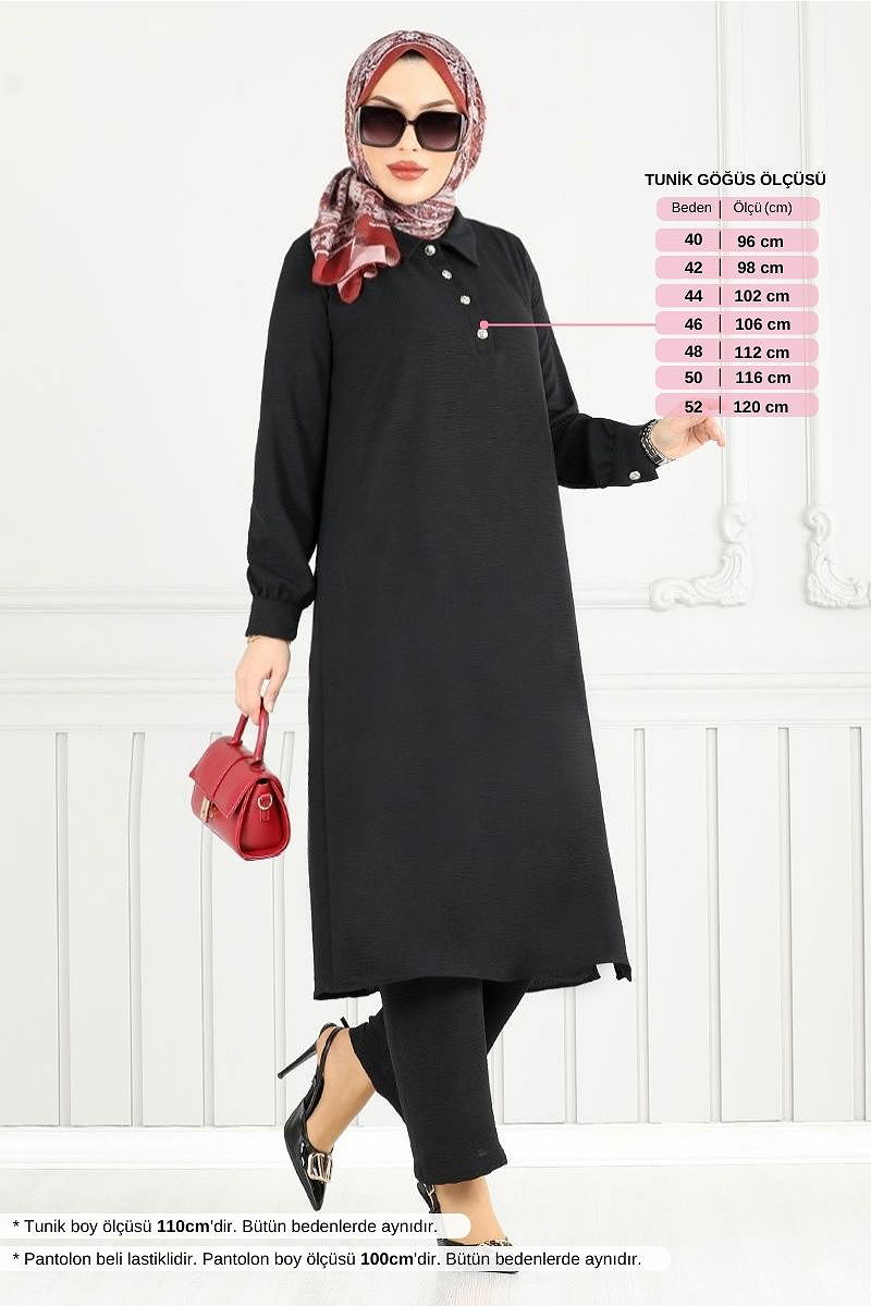 Ürün Özelliği : Yeni sezon tesettür moda ürünüdür. Ürün Gömlek yakadır. Ürün Önden kullanılabilir yarım düğmelidir. Tunik yandan yırtmaçlıdır.. Astarsızdır. Pantolon beli lastiklidir. Manşet düğmeleri aktiftir. Konsept fotoğraf çekimlerinden dolayı üründe ton farklılığı olabilir.