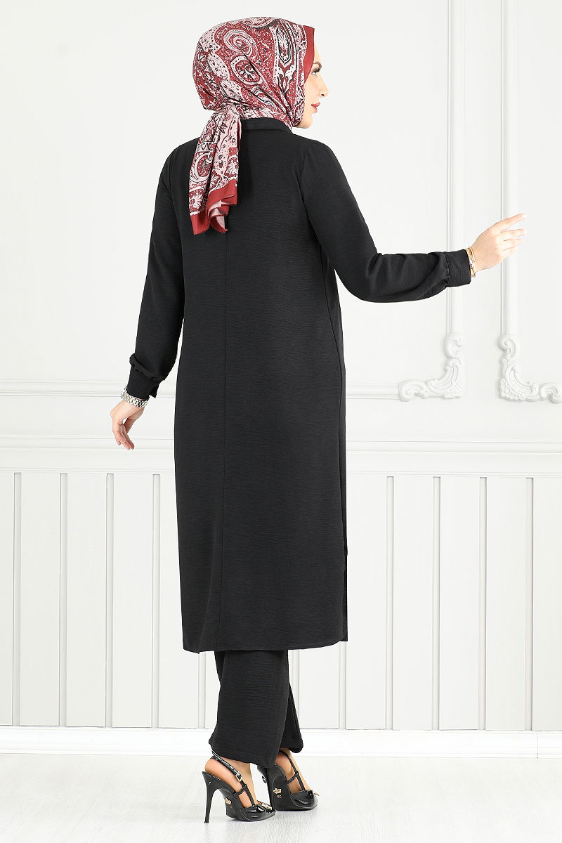 Yandan Yırtmaçlı Aerobin Takım model, tesettür tarzınıza özgün bir yaklaşım sunar. Dört mevsim boyunca rahatlıkla kullanabileceğiniz bu ürün, 30 derecede hassas yıkama ile temizlenebilir. Aerobin kumaştan üretilmiş olan bu takım, gömlek yaka tasarıma ve ön yarımda kullanışlı düğmelere sahiptir. Tunik yanlardan yırtmaç detaylarıyla hareket özgürlüğü sağlar ve astarsız yapısıyla hafifliği ön plana çıkarır. Pantolonun lastikli beli ve aktif manşet düğmeleri konfor ve şıklığı bir arada sunar.